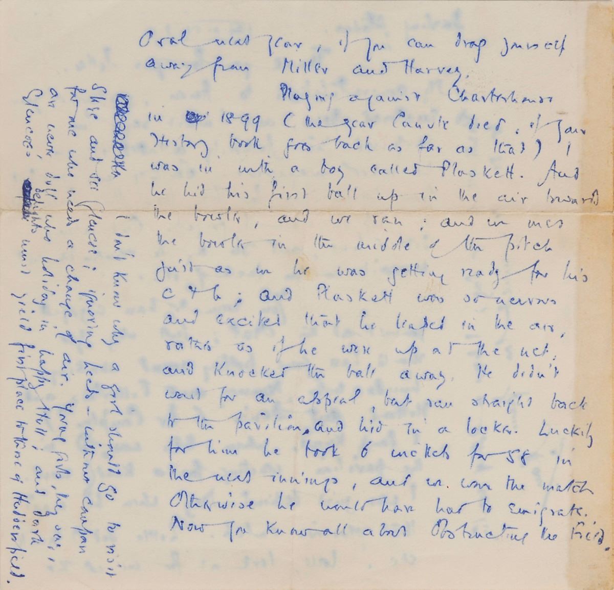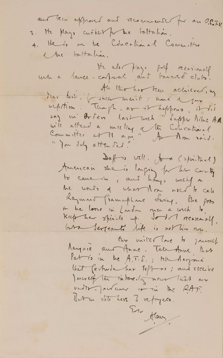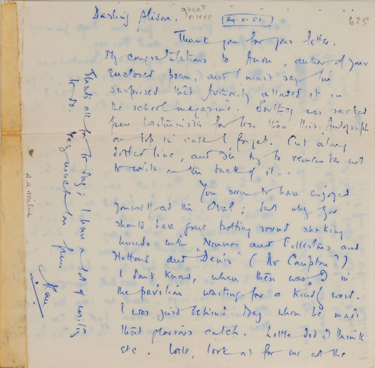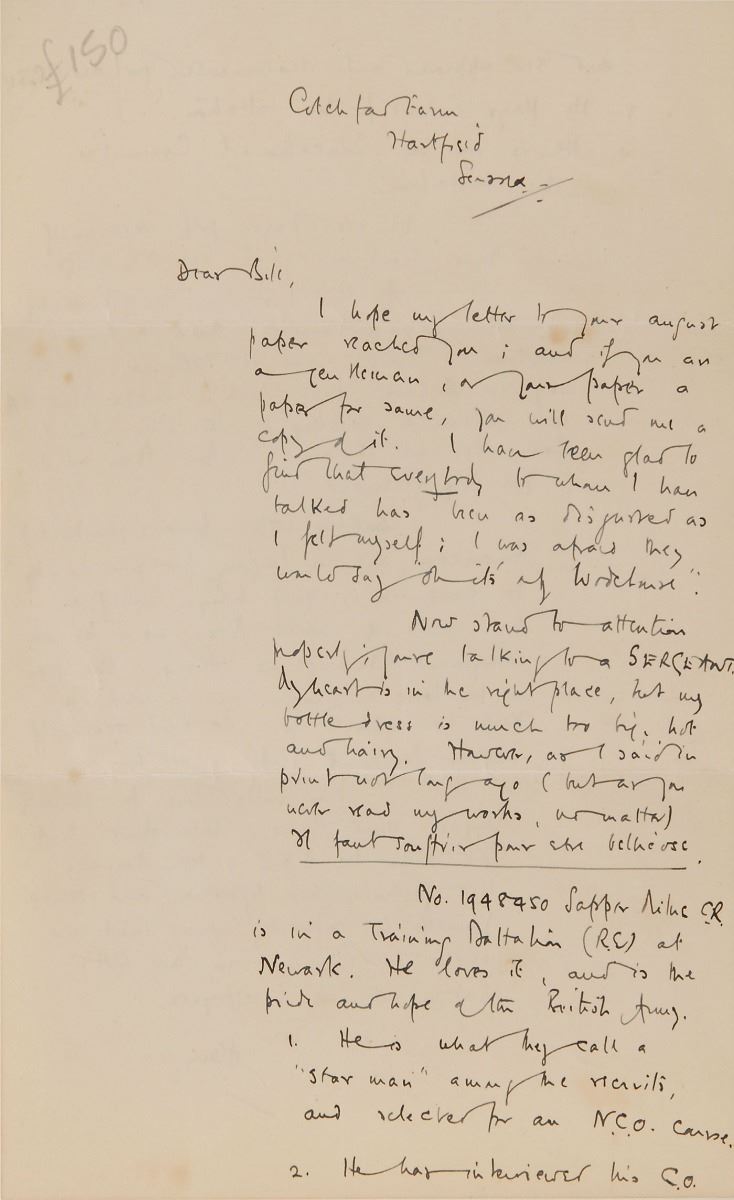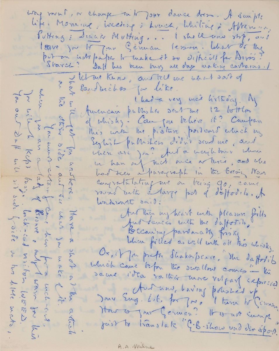 British author (1882–1956) who, despite a large body of novels, plays, and other ‘adult’ writings, will forever be most closely associated with his much-beloved series of Winnie-the-Pooh stories. Three ALSs, each signed "Alan," six pages total, dated between 1941 and 1952. Two letters are addressed to "Darling Allison," and another is addressed to "Bill." The earliest letter, postmarked July 2, 1941, relates to the current standing of his son Christopher in the military, in part: "No. 1948450…is in a Training Battalion (RE) at Newark. He loves it, and is the pride and hope of the British Army…He is what they call a 'star man'…He has interviewed his C. O. and been approved and recommended for an O. C. T. V…He is on the Educational Committee in the battalion. He also plays golf occasionally with a lance-corporal"; the other two lengthy letters consist of Milne's thoughts on a recent birthday, his past as a cricket player, and he even adds an amusing poem, "And then my heart with pleasure fills / dances with the daffodils / becoming pardonably frisky / when filled as well with all this whiskey." In overall very good to fine condition, with old tape along the edge of one page. Accompanied by the original mailing envelope for the earliest letter, as well as a postal cover with a cachet of Winnie the Pooh, signed in black felt tip by Christopher Milne. Pre-certified PSA/DNA.