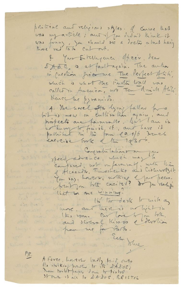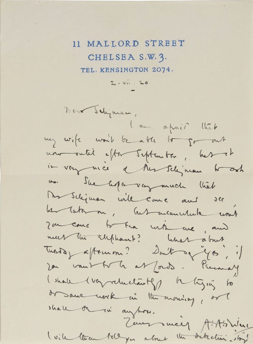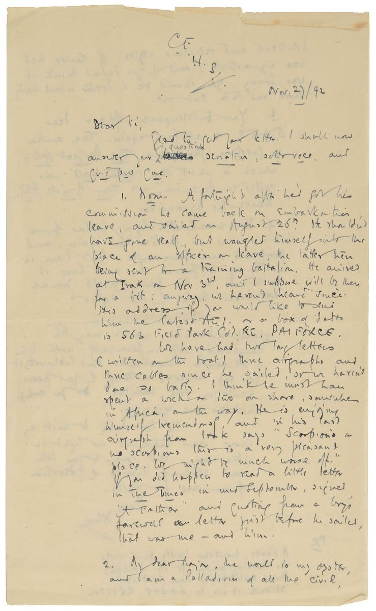 Two ALSs, signed "Blue" and "A. A Milne," three pages in total, dated July 2, 1920, and November 27, 1942. Both letters are addressed to close friend Vincent Seligman. The earlier letter, penned on Mallord Street letterhead, in part: "I am afraid that my wife won't be able to go out now until after September, but it is very nice of Mrs. Seligman to ask us. She hopes very much that Mrs. Seligman will come and see her later on, but meanwhile won't you come to tea with me, and meet the elephant? What about Tuesday afternoon?" The second letter, with Milne adding "C. F, H. S.," for Cotchford Farm, Hartfield, Sussex, in part: "I shall now answer your questions…1. Moon. A fortnight after he'd got his commission he came back on embarkation leave, and sailed on August 26th. He shouldn't have gone really but wrangled himself into the place of an officer on leave…he arrives at Irak on Nov 3rd, and I suppose will be there for a bit: anyway, we haven't heard since…2. My dear major, the world is my oyster, and I am Palladium of all the civil, political and religious styles. Of course that was my article; and if you didn't think it was funny, you should see a doctor about having those red tabs cut out…3. Your intelligence officer, dear D. A. D. O., is at fault again. The author in question gives me The Perfect Alibi, which is what The Fourth Wall was called in America…Hence the pyramids. 4. The novel after lying fallow for a bit is now in cultivation again, and prospects are farmable." Milne adds a short poem for a postscript, "A force, however badly paid, owes / its striking power to its DADOS; / from toilet paper down to pistol / it owes it all to DADOS Bristol." In overall fine condition, with creasing to the top of one of the letters.