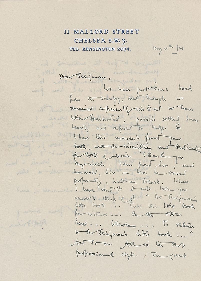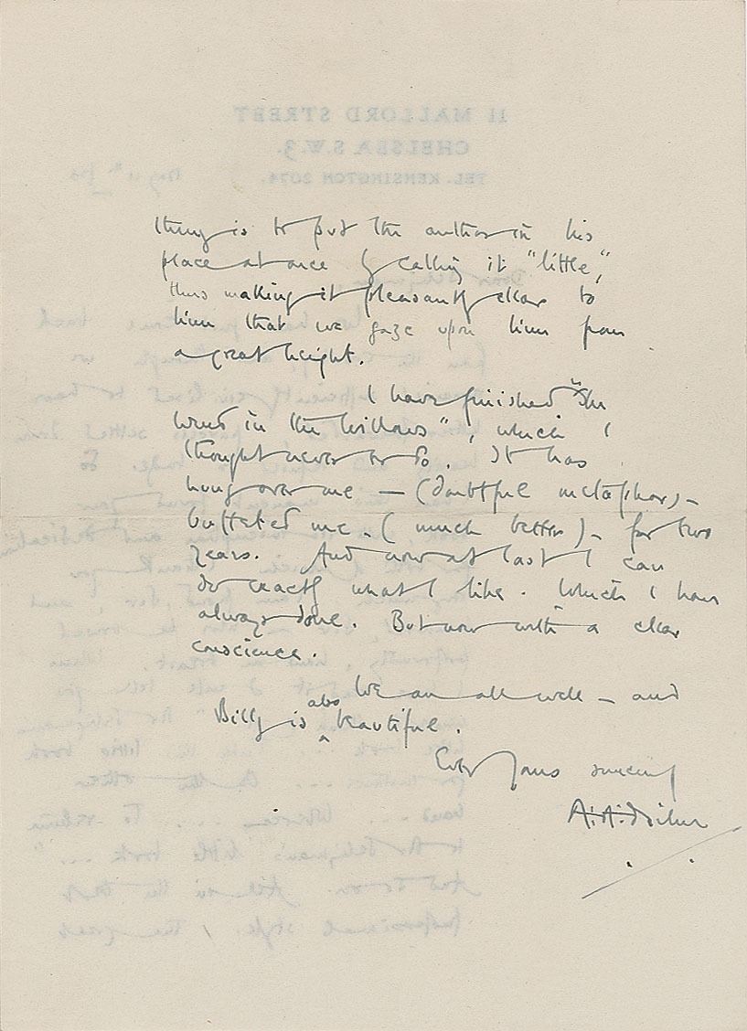 ALS, one page both sides, 5.5 x 7.5, 11 Mallord Street letterhead, May 11, 1923. Letter to longtime friend Vincent Seligman, in full: "We have just come back from the country, and though we remained sufficiently civilized to have letters forwarded, parcels settled down heavily and refused to budge. So I have this moment found your book, with its inscription and dedication for both of which I thank you very much. I am proud, Sir, and honored, Sir—then he bowed profoundly, hand on breast. When I have read it I will tell you what I think of it. 'Mr. Seligman's little book…Take this little book for instance…On the other hand…Whereas…to return to Mr. Seligman's little book…' And so on. All in the most professional style. The great thing is to put the author in his place at once by calling it 'little,' thus making it pleasantly clear to him that we gaze upon him from a great height. I have finished 'The Wind in the Willows,' which I thought never to do. It has hung over me—(doubtful metaphor)—buffeted me—(much better)—for two years. And now at last I can do exactly what I like, which I have always done. But now with a clear conscience. We are all well—and Billy is also beautiful." In fine condition. A decidedly legible example enhanced furthermore by the mention of the Kenneth Grahame classic, which Milne adapted for the stage in 1929 as Toad of Toad Hall.