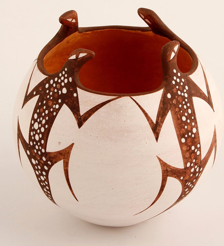 A. A. Peynetsa lizard jar. Jar features 4 lizards in relief that also have a textured skin made by using drops of slip that rise above the lizards' bodies. 4.75" h x 5" diameter. Jar has a hairline crack. Anderson Peynetsa, Zuni Pueblo, Collaborates with Avelia Peynetsa, signs AA Peynetsa), (Signs A. Peynetsa alone), active ca. 1980s-present: traditional black-on-redware, polychrome seed pots, jars, ollas, bowls, canteens, duck effigy pots. Anderson Peynetsa is the son of Charles and Wilma Peynetsa; brother of Agnes Peynetsa and Priscilla Peynetsa; husband of Avelia Peynetsa. Date: c.1998 Location: Zuni Pueblo, New Mexico HWAC # 52717
