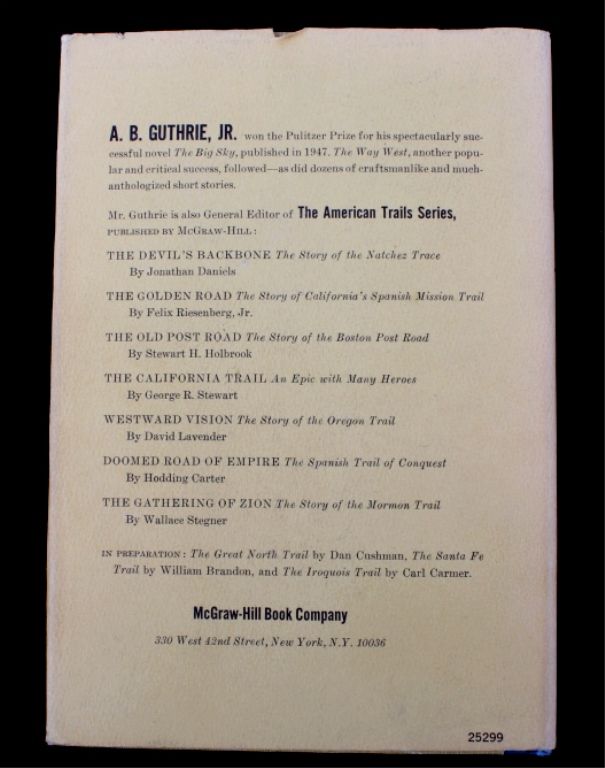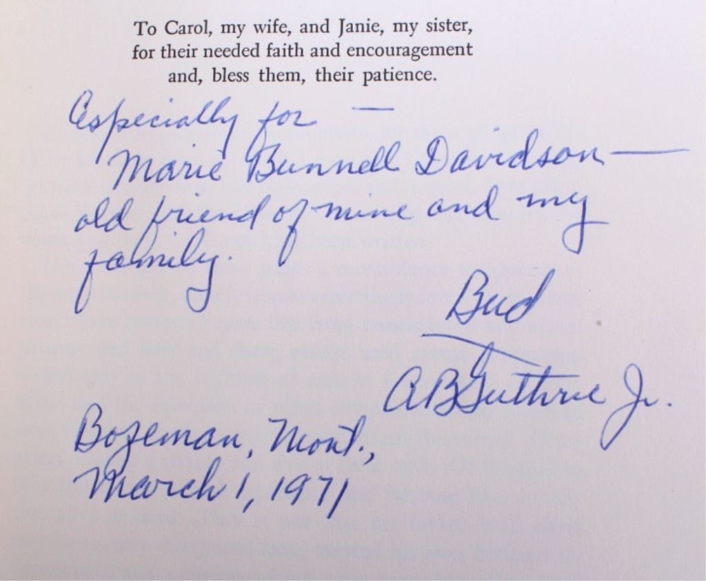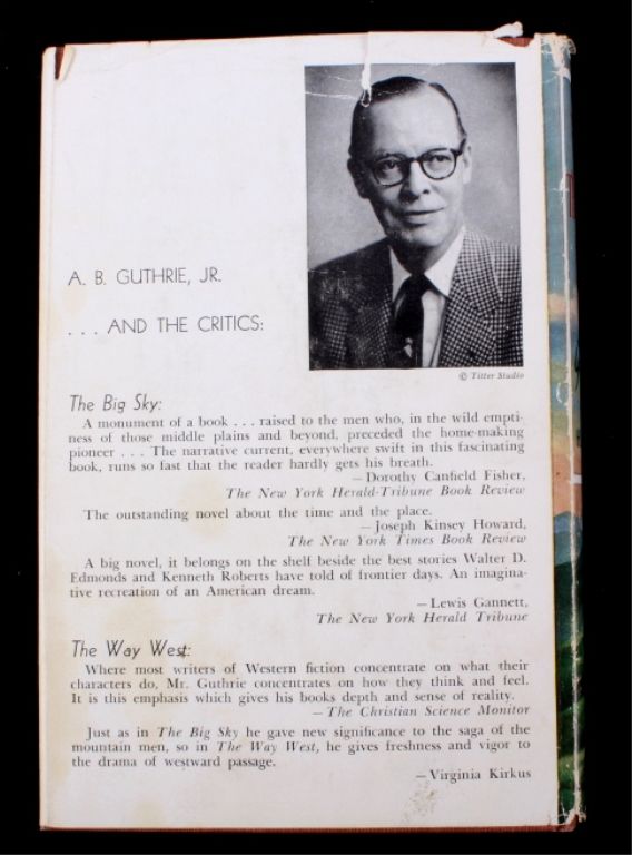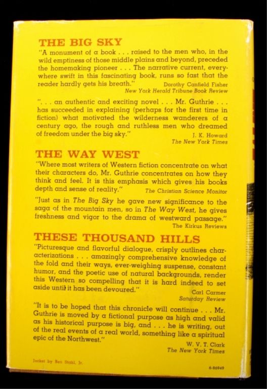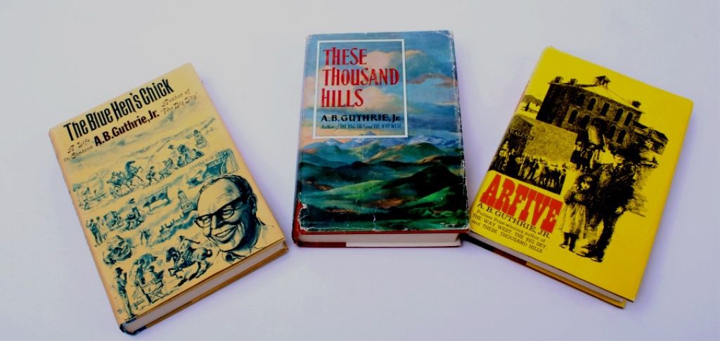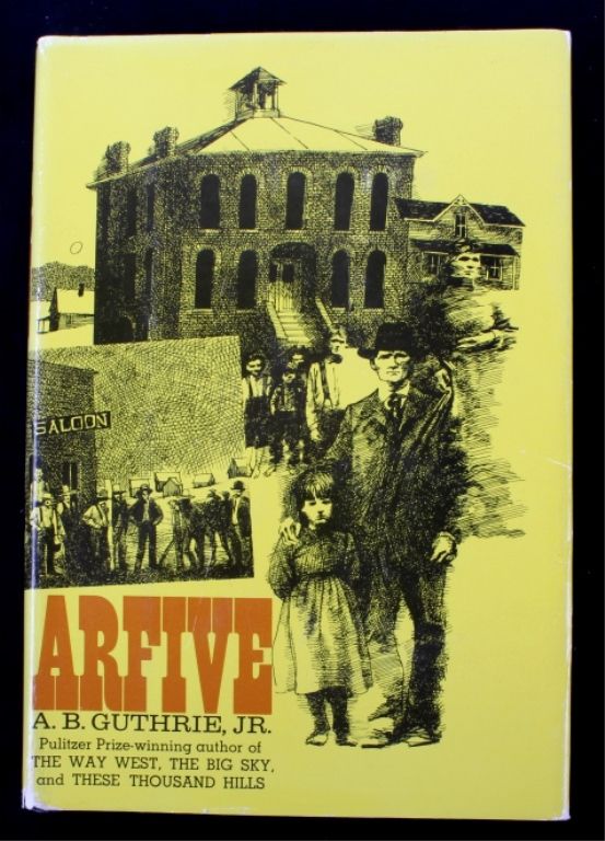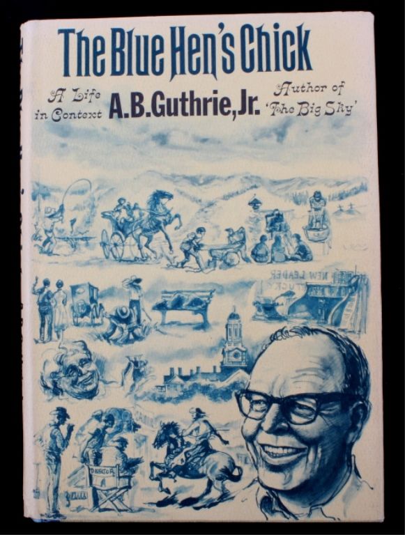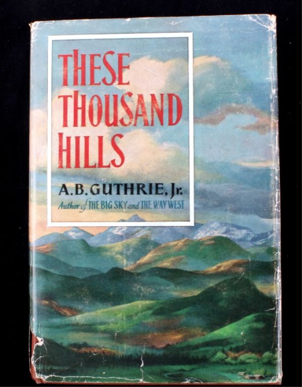 This lot includes 3 books written by A.B. Guthrie. The books are "These Thousand Hills" (1956), "Arfive" (1970 signed by the author), and "The Blue Hen's Chick". ArfiveSigned with an inscription from the author. First Printing Clean pages with little wear to the interior. Dust jacket has some wear to the edges from use and shelving.These Thousand Hills First Printing Clean pages with little wear to the interior. Dust jacket has some wear/damage to theedges from use and shelving, a piece missing on the spine. The Blue Hen’s Chick First EditionClean pages with little wear to the interior. Dust jacket has some wear to the edges from use and shelving. Name written on the first page.