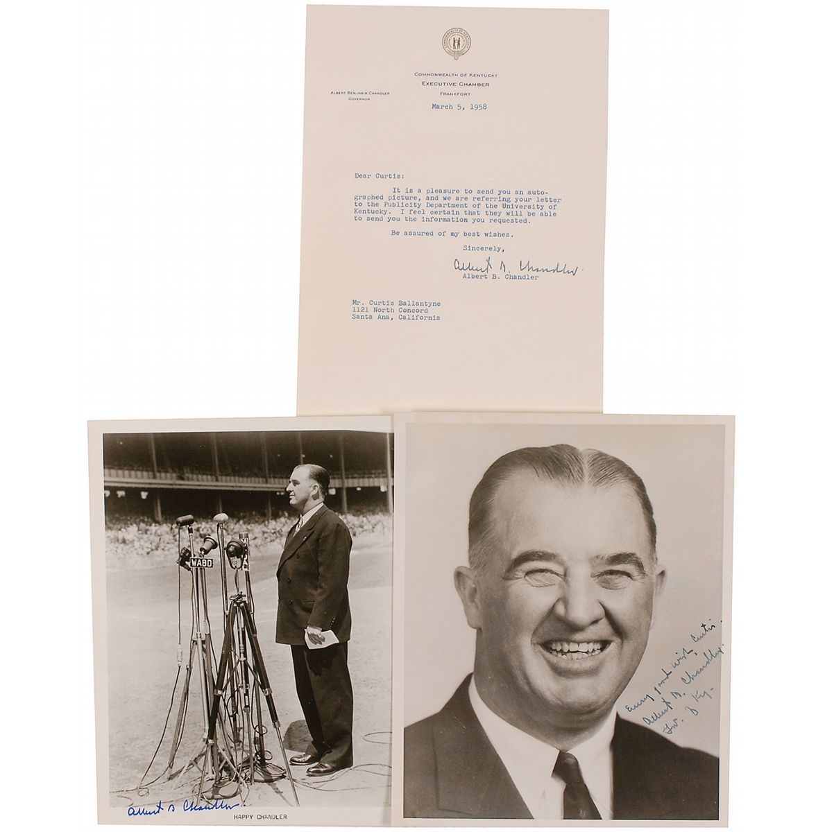 Three items: one vintage glossy 8 x 10 photo of Chandler as governor of Kentucky, signed and inscribed in fountain pen, “Every good wish, Curtis, Albert B. Chandler, Gvr. of Ky”; one glossy 8 x 10 photo of Chandler giving a speech at a baseball stadium, signed in blue felt tip; and one TLS, one page, 7.25 x 10.5, Kentucky Executive Chamber letterhead, March 5, 1958, responding to an autograph request and signed at the conclusion in fountain pen. Scattered marks, creases, and impressions to both photos, otherwise fine condition. Letter accompanied by original mailing envelope.