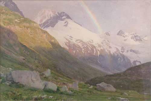 A B Nowell watercolour, Rainbow over an alpine valley, signed, 15 x 22 ins. £600-800