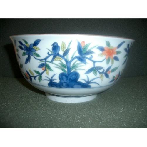 A BLUE AND WHITE OPAQUE GLASS CHINESE BOWL CONDITION SMALL HAIR LINE CRACK