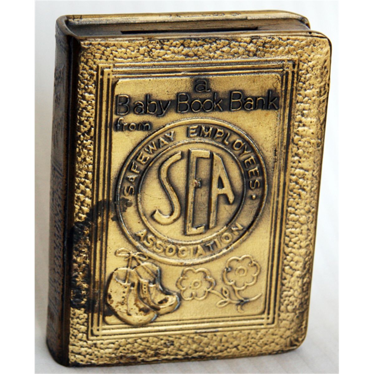 A BABY BOOK BANK. SAFEWAY EMPLOYEES ASSOCIATION. Coin openings at top and on back. No Key lock. No key, serial number or patent number. 8cm x 12cm x 2cm. ‘Book of Thrift’ on spine. Brass. Maker-Banthrico Inc., Chicago USA. EF.