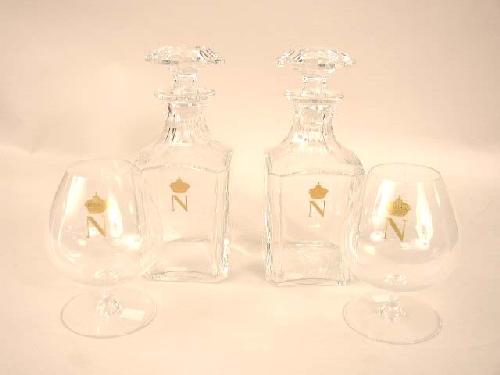 A BACCARAT COLORLESS GLASS; Twelve piece decanter set, including two decanters, ten brandy snifters, gilt decorated with Napoleon symbol