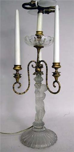 A BACCARAT FROSTED GLASS FIGURAL TWO-LIGHT LAMP; With two electrified lights above three faux candles on downswept arms above a figural support on a circular reeded base (electrified, repairs) 24"h