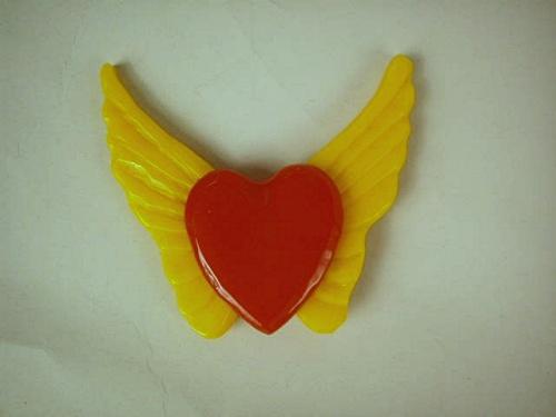 A BAKELITE YELLOW BUTTERFLY BROOCH, set with red bakelite heart-form center, 4"l x 3-1/2"h