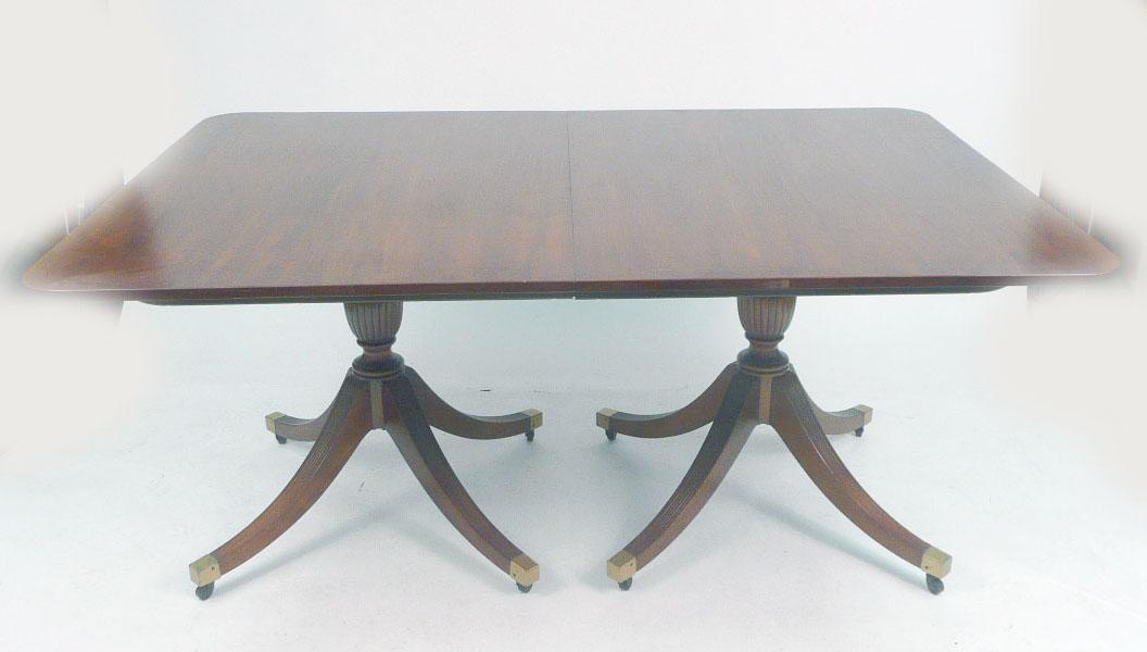 A BAKER FURNITURE REGENCY-STYLE INLAID MAHOGANY EXTENSION TWO-PEDESTAL DINING TABLE