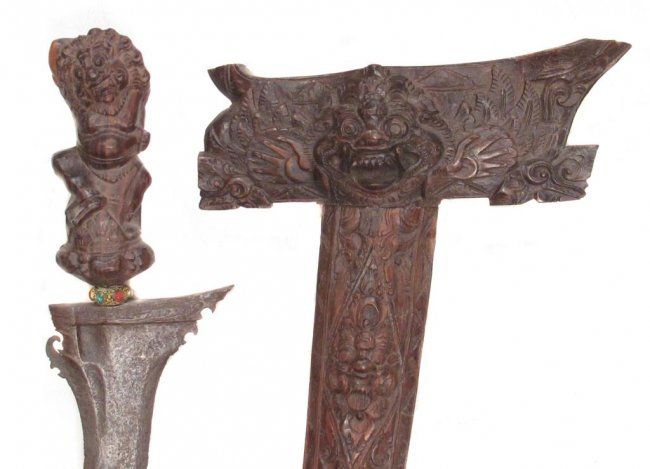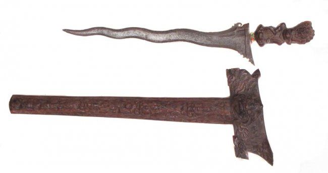 A large example with finely carve grip and waved, actively-patterned Damascus blade. In its matching scabbard.Mid-20th century.Overall length 60.3 cm.