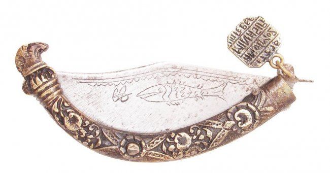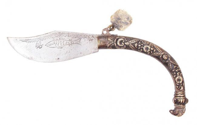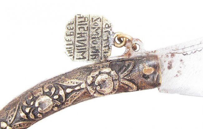 The curved case of brass with baroque motifs and hooked terminal, the broad blade with clipped tip etched with a flower on one side and a fish on the other. With a rectangular brass seal attached, containing four lines of characters. Mid-19th century.Overall length 12 cm.
