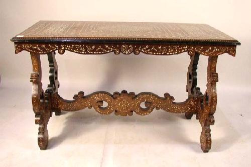 A BAROQUE STYLE BONE-INLAID WALNUT CENTER TABLE; With a molded rectangular top on a pierced modified trestle base (various repairs) 31 1/2"h x 4'4 1/2"w 26"d