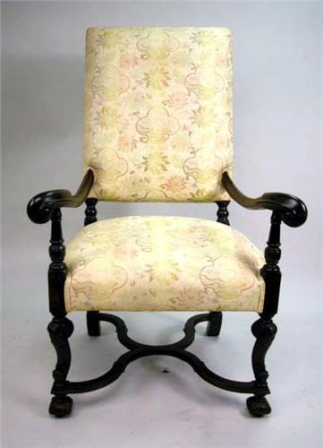 A BAROQUE STYLE CARVED MAPLE ARMCHAIR; The rectangular upholstered back, continuing to outscrolled arms with "rams horn" hand holds ending on carved legs joined by stretchers 47 1/2"h