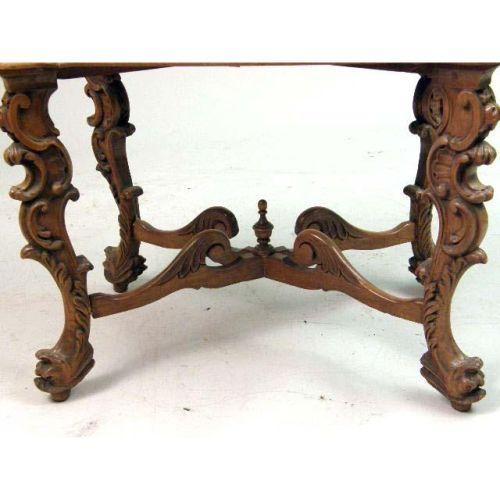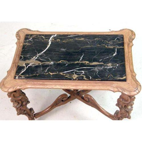 A BAROQUE-STYLE OAK INSET MARBLE TOP OCCASIONAL TABLE<BR><BR>English, with scroll foliate legs on paw feet, 19"h x 26"w x 17"d