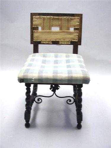 A BAROQUE STYLE WROUGHT-IRON WALNUT SIDE CHAIR; in the Italian or Spanish tradition, with an iron floral stretcher and barley-twist legs, back unupholstered.