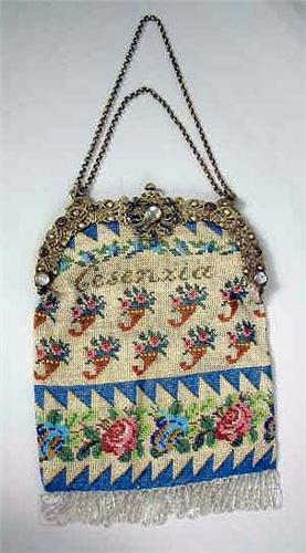 A BEADED BAG Beige ground with floral motif, inscribed in beads Cesenxia Schmidt 1840, frame inset with hard-stones, gold chain held by swan motif