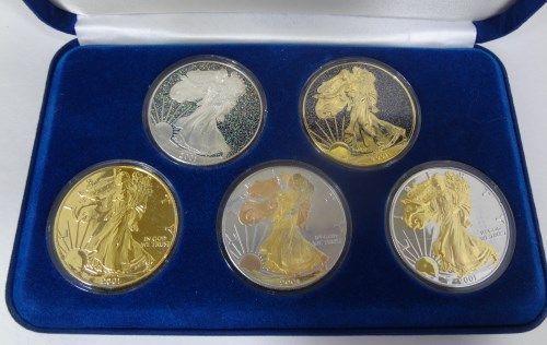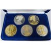 THIS ONE OF THE MORE POPULAR AFTER MARKET SETS, INCLUDES: 24 KARAT GOLD PLATED, 24 KARAT GOLD AND RHODIUM PLATED, YELLOW ROSE AND GOLD PLATED, 24 KARAT GOLD PLATED WITH OPALESCENT HIGHLIGHTS, AND BRILLIANT UNCIRCULATED WITH OPALESCENT HIGHLIGHTS, ESTIMATE, $175.00 TO $190.00