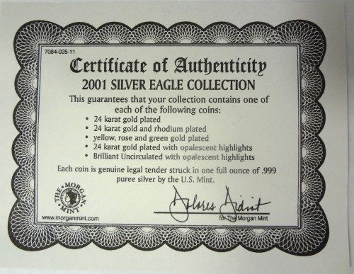 A BEAUTIFUL 5 PIECE 2001 AMERICAN SILVER EAGLE SET, ALL ONE OUNCE .999 SILVER
