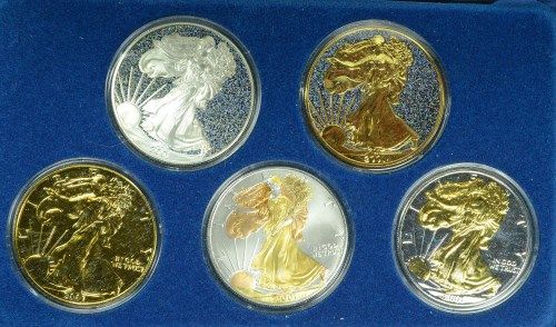 THIS ONE OF THE MORE POPULAR AFTER MARKET SETS, INCLUDES: 24 KARAT GOLD PLATED, 24 KARAT GOLD AND RHODIUM PLATED, YELLOW ROSE AND GOLD PLATED, 24 KARAT GOLD PLATED WITH OPALESCENT HIGHLIGHTS, AND BRILLIANT UNCIRCULATED WITH OPALESCENT HIGHLIGHTS, ESTIMATE, $175.00 TO $190.00