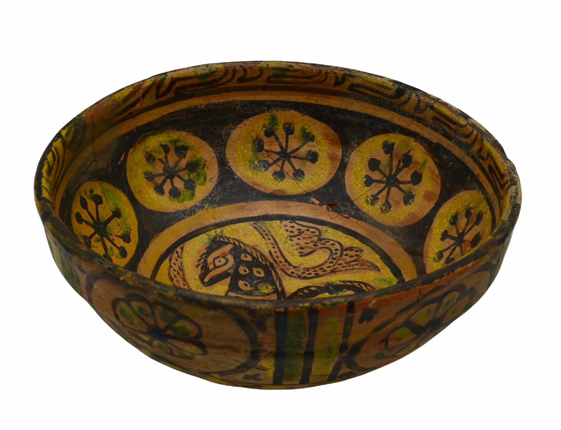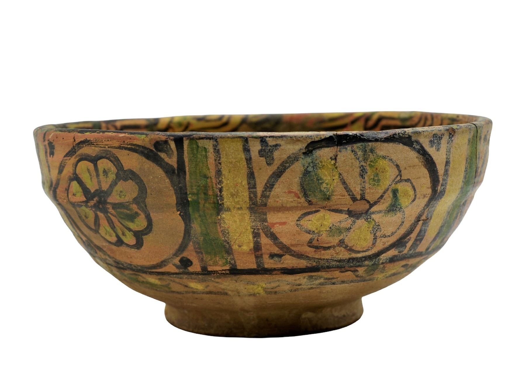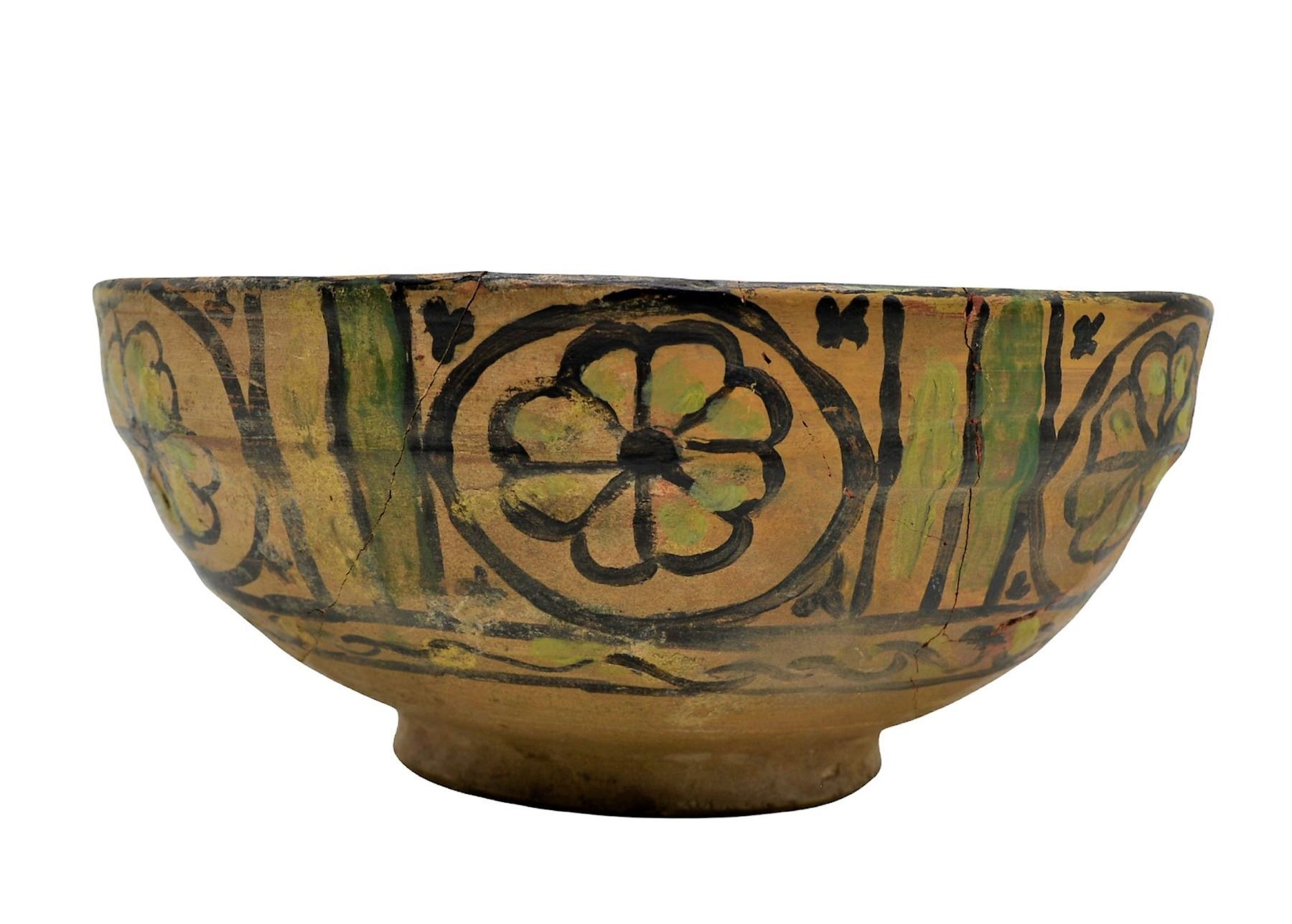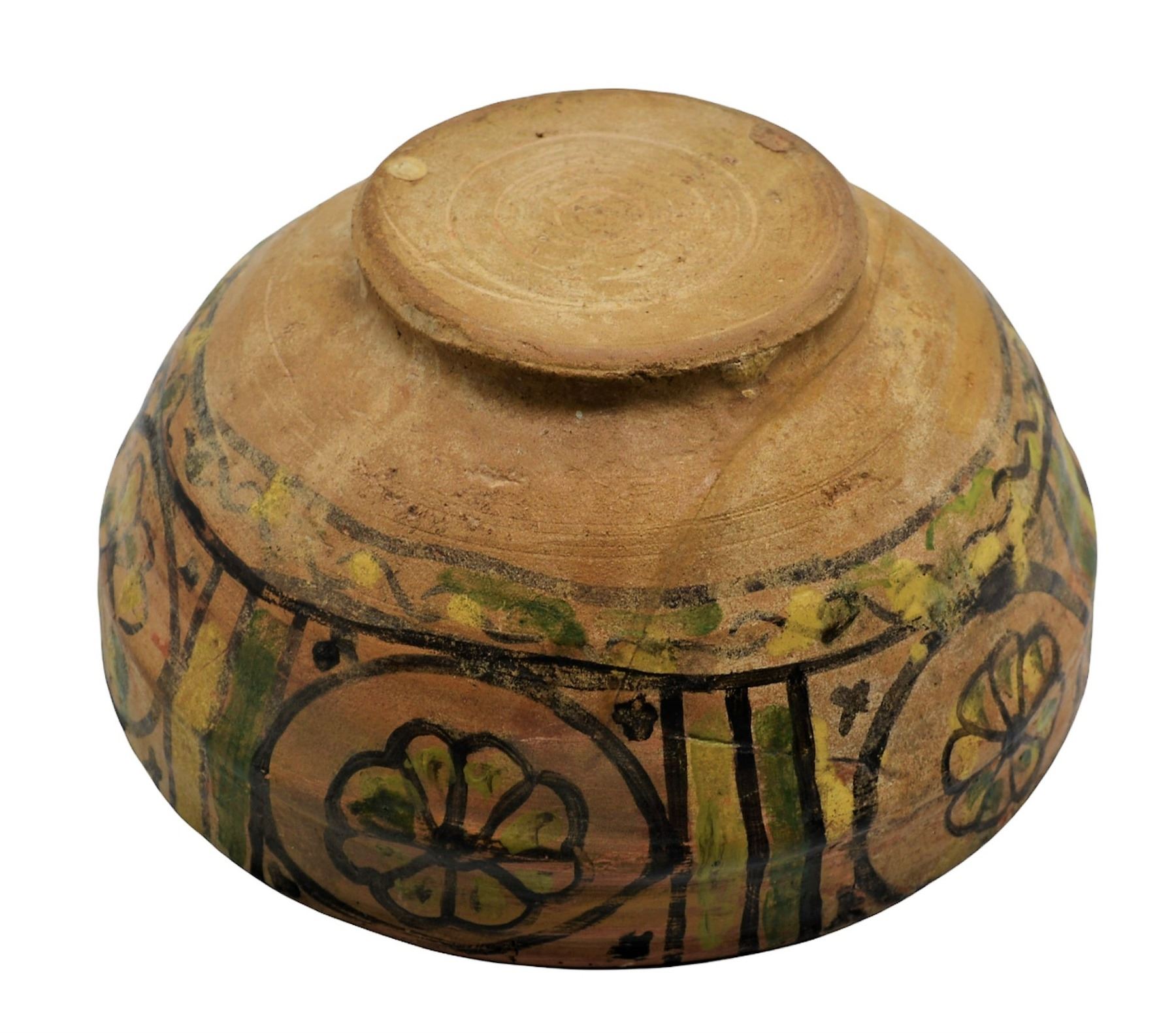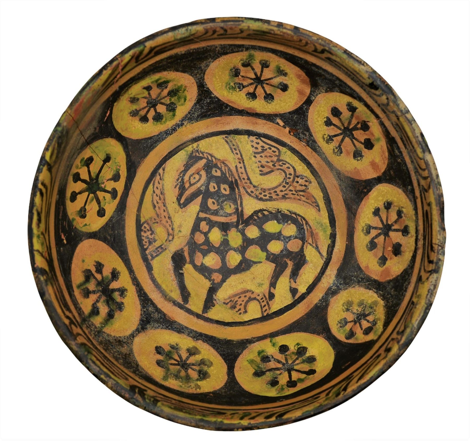 A BEAUTIFUL & VERY RARE ANCIENT ISLAMIC NISHAPUR BUFF WARE POTTERY BOWL, ABBASID OR SAMANID PERIOD CIRCA 10TH CENTURY.Earthenware, polychrome decoration. This earthenware bowl was produced in the 10th century in Nishapur. The bowl of deep round shape is resting on a short foot. In the center it shows the depiction of a Horse. The glazing décor is executed in the typical colors of Nishapur ware black, brown, green and yellow. Animal & Floral motifs are a frequent motif of the Nishapur ware of the 10th century. During the Islamic Golden age, especially in the 9th and 10th century, Nishapur was one of the centers of pottery and related forms of art. The bowl is in good condition. featuring a stylised Horse in center bordered with