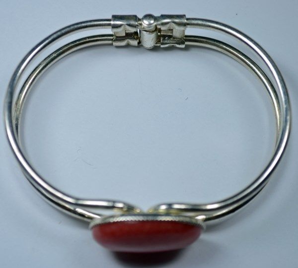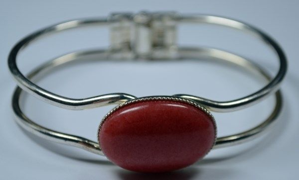 A BEAUTIFUL SIMPLE PIECE. A METAL CLASP BRACELET WITH A DARK PINK STONE MOUNTED ON TOP. Silvertowne is rated as a top company on Proxiblog because of its expert grading.