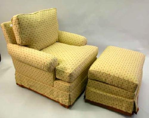 A BEIGE AND RED UPHOLSTERED CLUB CHAIR AND OTTOMAN;
