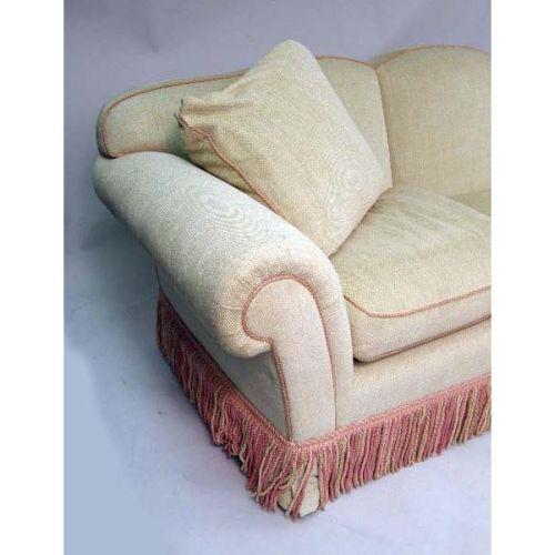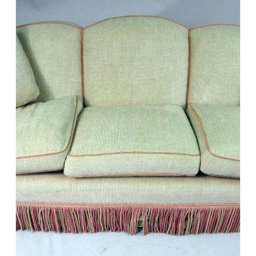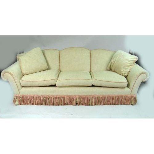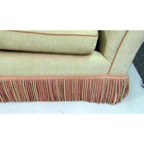 A BEIGE LINEN UPHOLSTERED SOFA<BR><BR>With three loose cushions and silk fringe, 30"h x 96"l, approximately 37"d