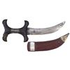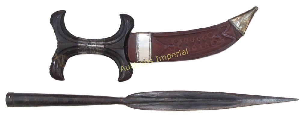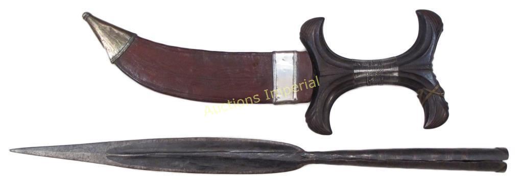 The first with carved hardwood grip and double-edged blade with pronounced curve at the tip, in its leather scabbard with silver locket. The second with straight, double-edged blade. Mid 19th and mid 20th century, respectively. Worn overall. Overall length of the longest 42.7 cm.