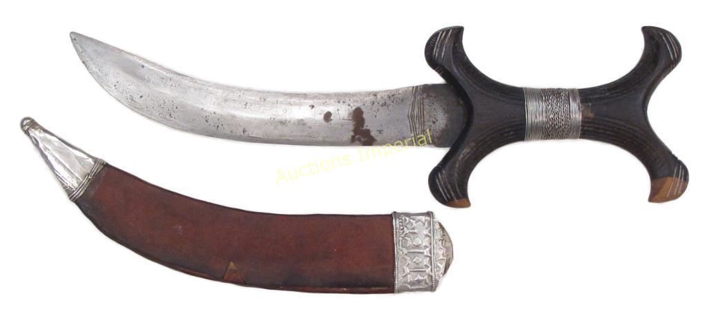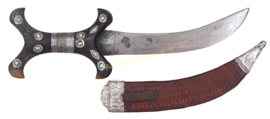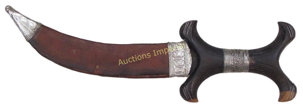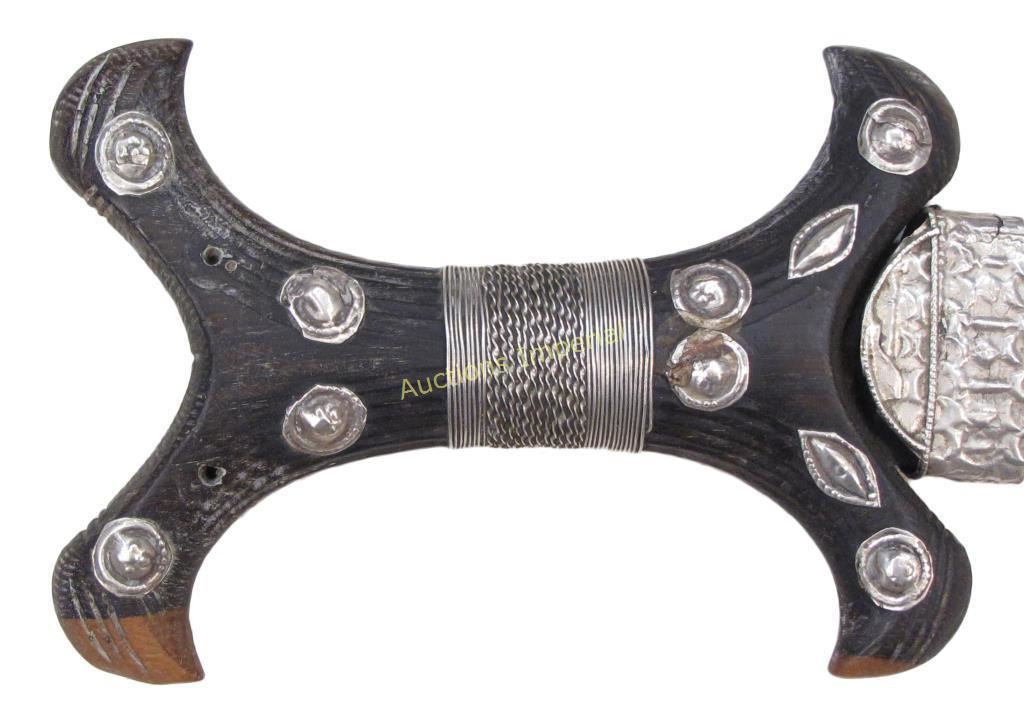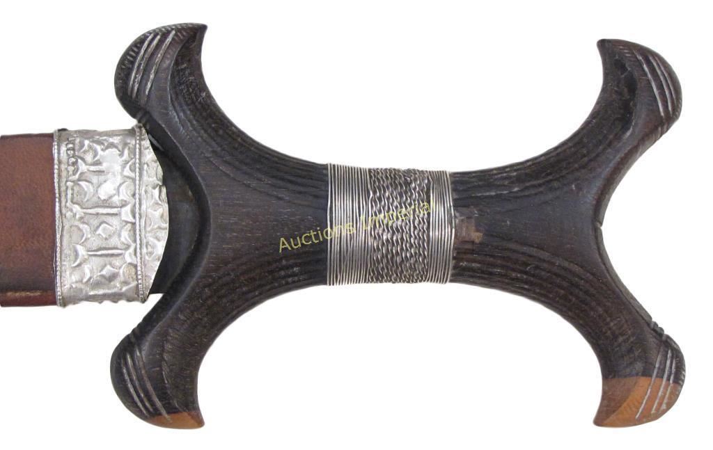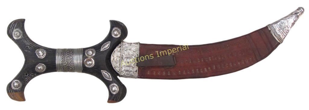 Of unusually high-quality workmanship. The carved hardwood grip of characteristic form, embellished with embossed silver studs and wire wrap to the center, the curved, double-edged blade retaining much original edge. The leather sheath tooled and mounted with well- embossed silver chape and locket. Last quarter of the 19th century. Overall length 32.2 cm each.