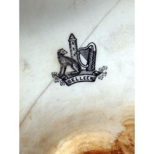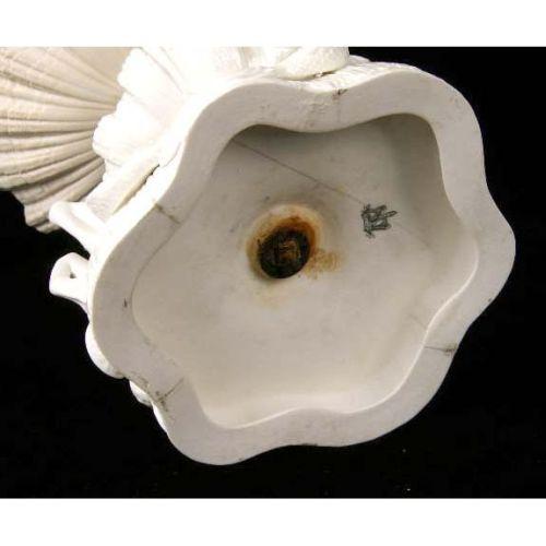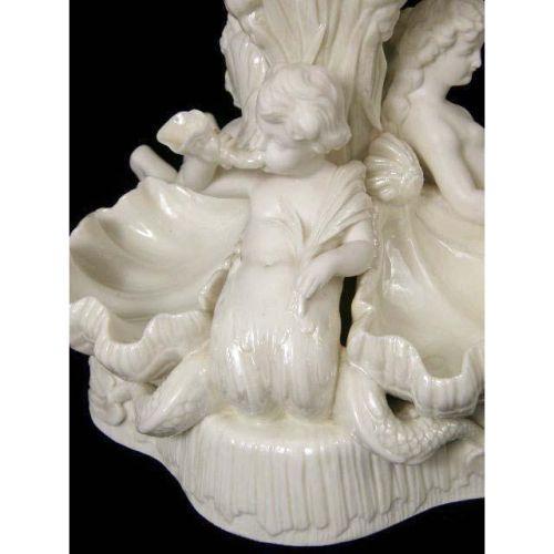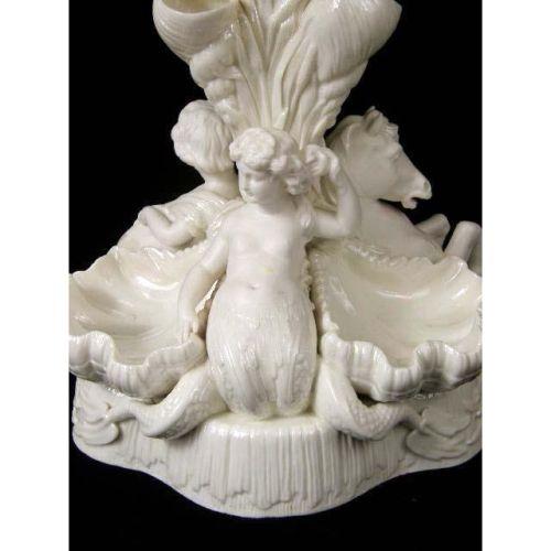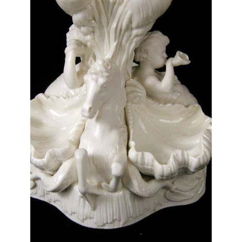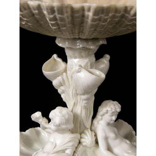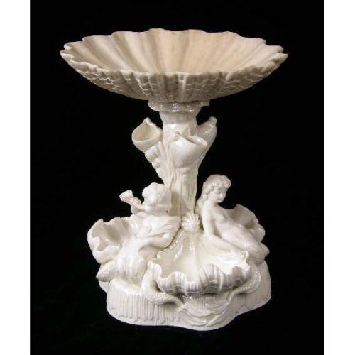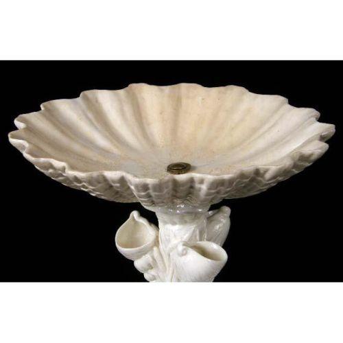 A BELLEEK SHELL-FORM PORCELAIN COMPOTE<BR><BR>with a mermaid and seahorse base, crack, repair, 13"h