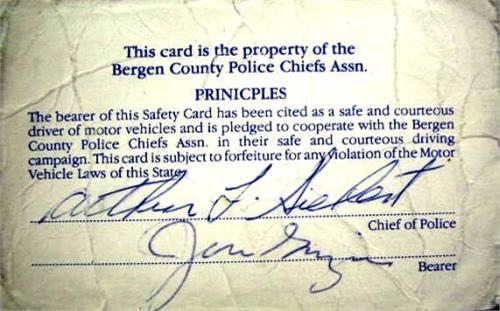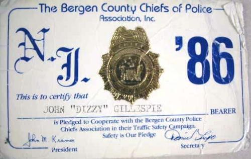 A BERGEN COUNTY CHIEFS OF POLICE ASSOCIATION, INC., NJ '86 CARD Certifying John "Dizzy" Gillespie, bearer, is pledged to cooperate with the Bergen County Police Chiefs Association in their Traffic Safety Campaign, signed on verso