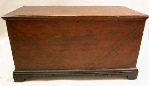A BLACK AND RED PAINTED BLANKET CHEST; Mahan tango Valley, Pennsylvania, of typical form with swirling black paint on a red ground, in a remarkable state of preservation, 26"h x 4'w x21"d