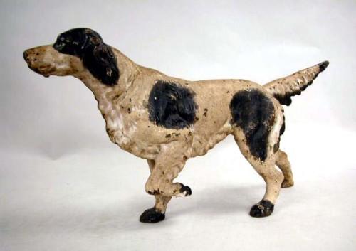 A BLACK AND WHITE PAINT-DECORATED SETTER FORM DOOR STOP;