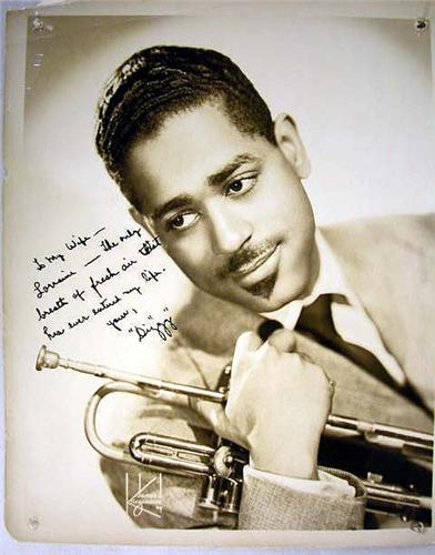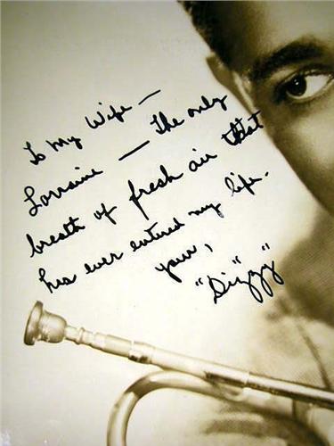 A BLACK AND WHITE PHOTOGRAPH OF DIZZY GILLESPIE HOLDING A TRUMPET Inscribed "to my wife Lorraine-the only breath of fresh air that has ever entered my life. Your Dizzy", together with a similarly affectionate birthday card from Dizzy to Lorraine, losses