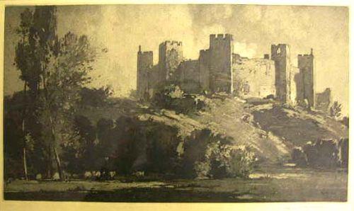 A BLACK AND WHITE PRINT; Depicting castle and cattle in foreground, signed LR illegible Leonard R. 13"h x 8"w