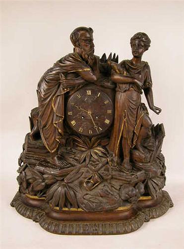 A BLACK FOREST CARVED AND PARCEL-GILT WALNUT MANTLE CLOCK; Probably Germany, (minor wear) 22"h x 21"w