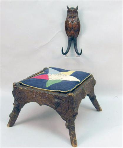 With chamois horns and glass eyes. Together with a Black Forest-style footstool with applied bark and a needlework pillow.