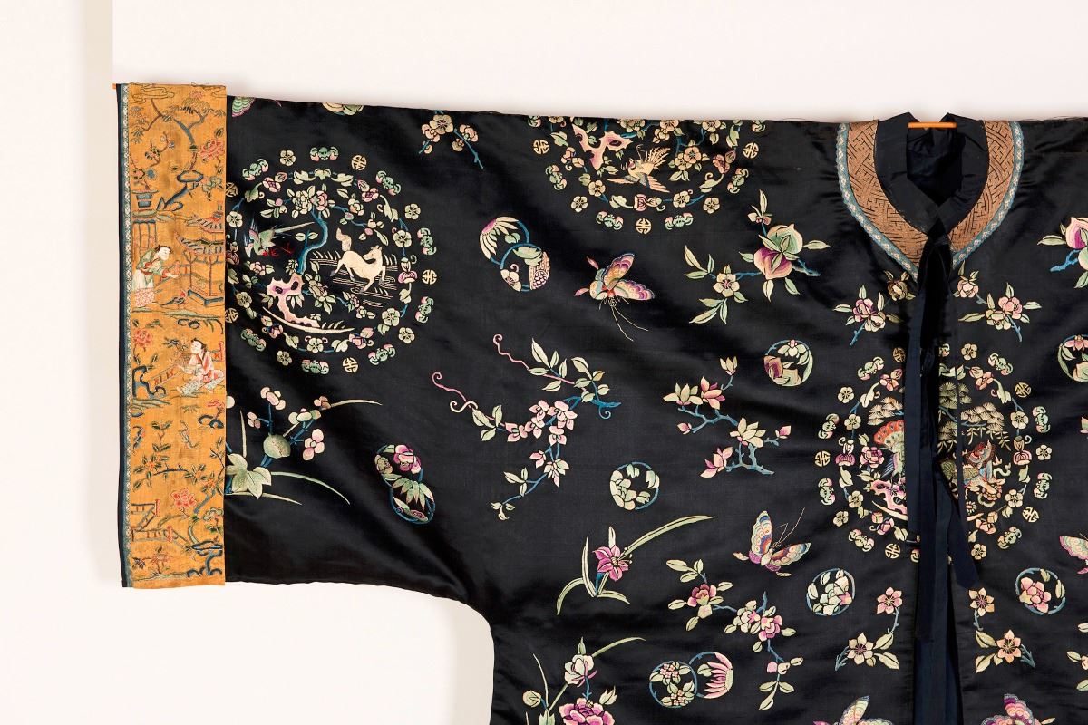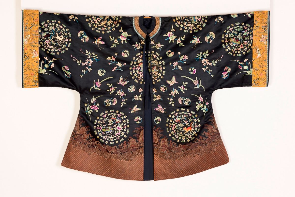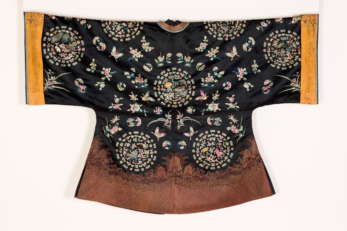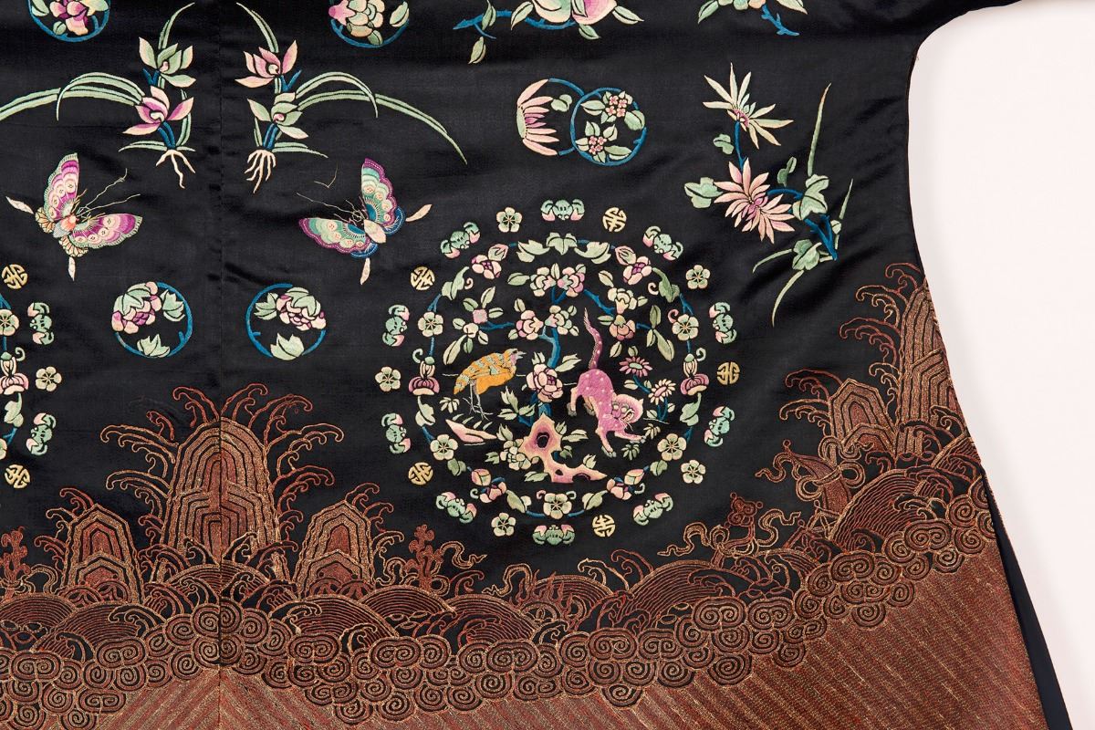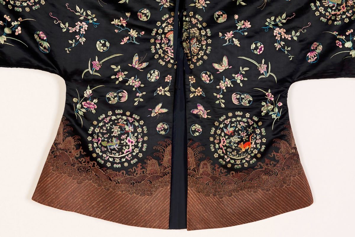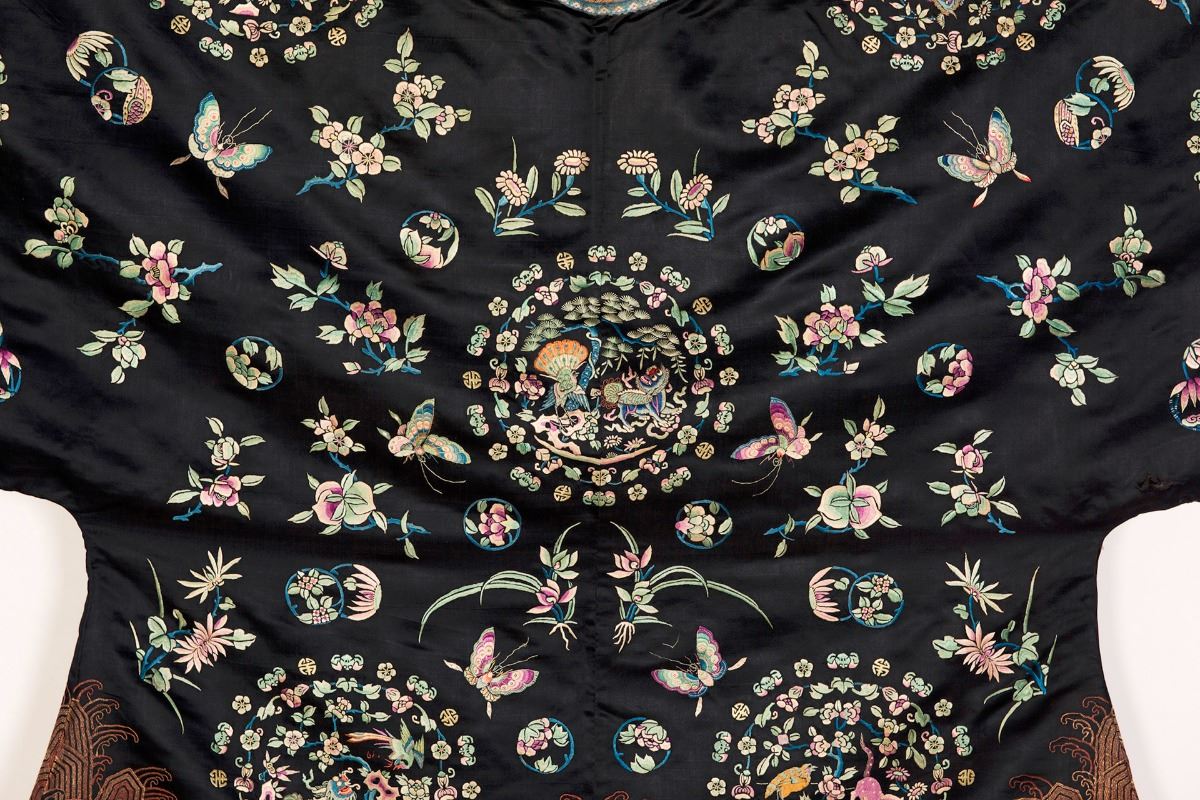 A midnight black satin brocade royal female courtiers cloak with center front opening, embroidered with auspicious beast roundels, flowers and butterflies, trimmed with ocher ribbons. Minor damage. Height 38" Width 57"