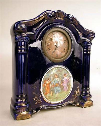 A BLUE AND GILT STENCIL-DECORATED MANTEL CLOCK; With central enamel decoration 10"h x 10"w x 3 1/2"d