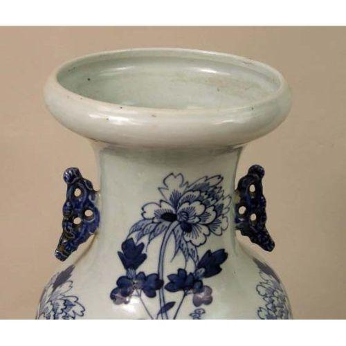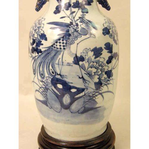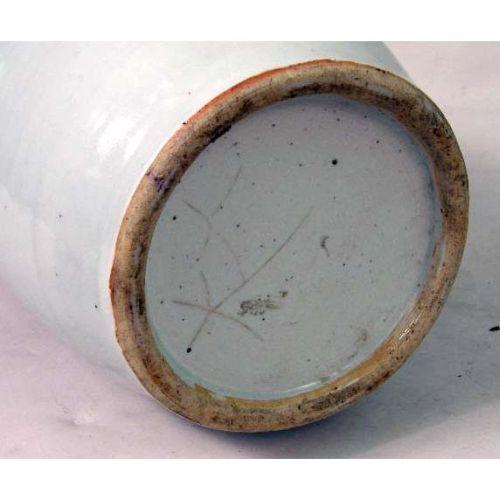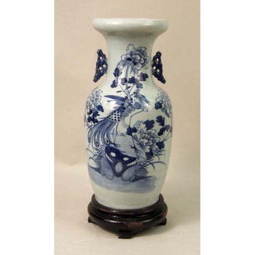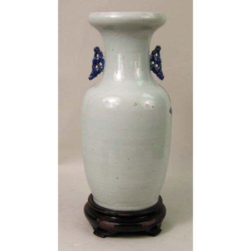 A BLUE-AND-WHITE GLAZED PORCELAIN VASE<BR><BR>Chinese, wood base associated, overall: 19-1/2"h x 8"dia.