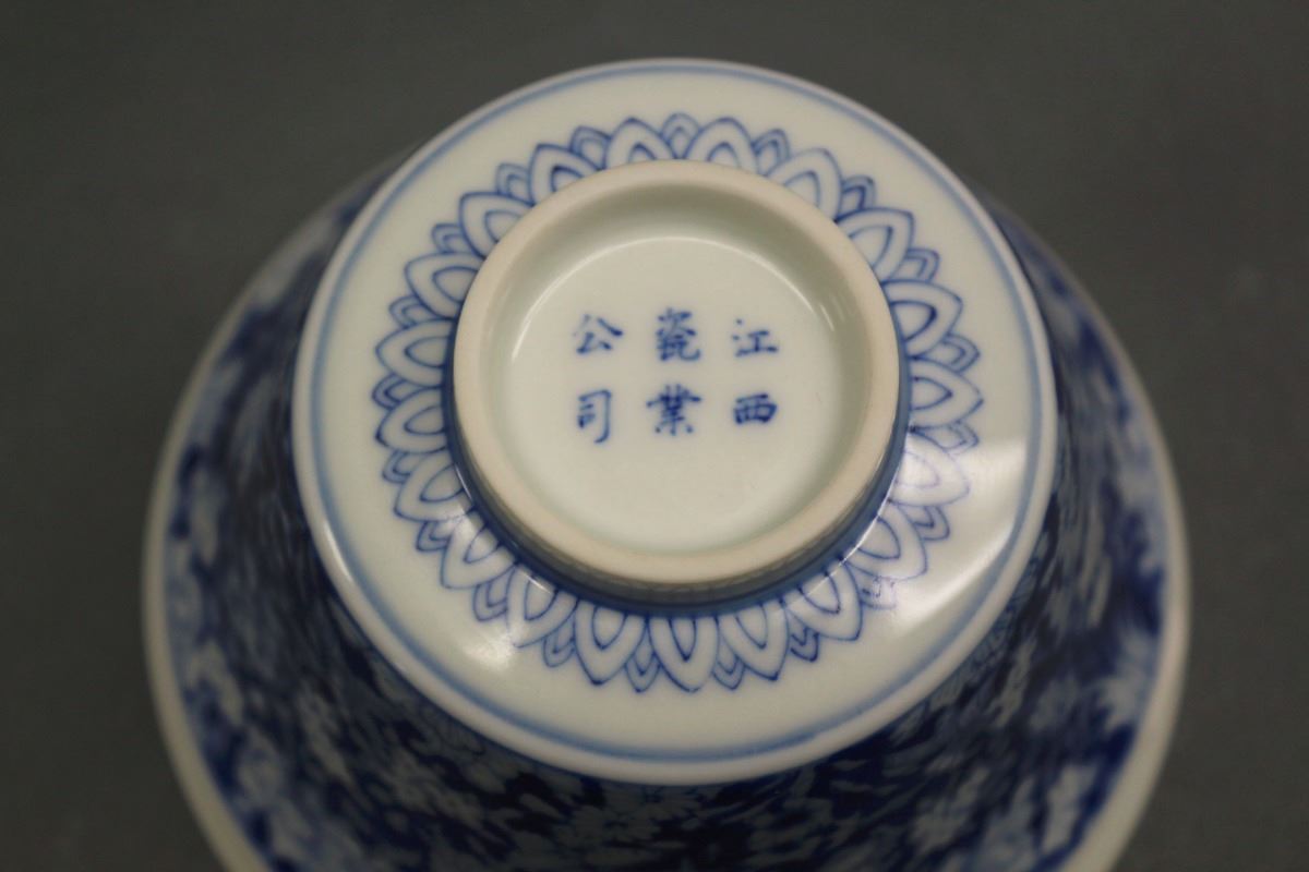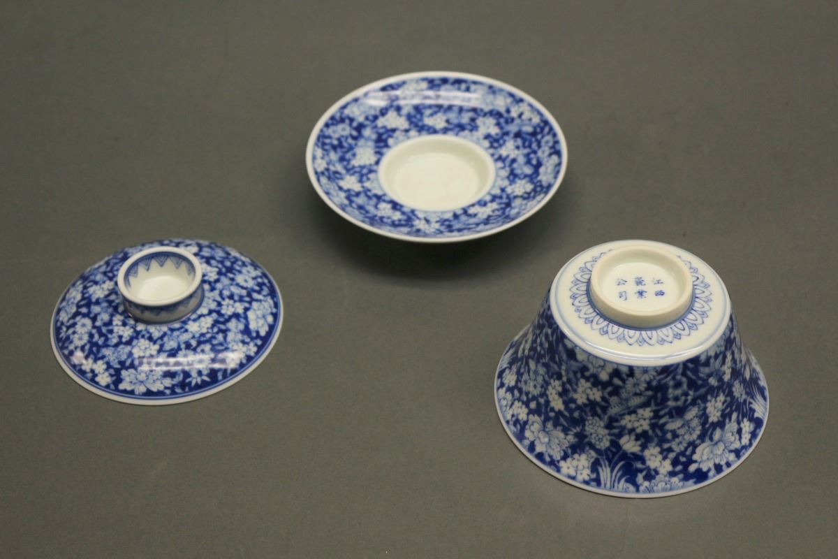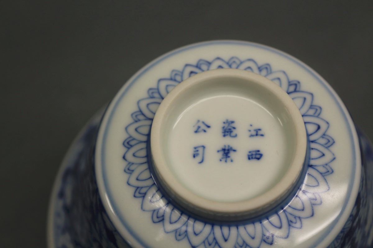 A Chinese blue and white porcelain cup with lid and tray, all featuring peony blossom design on the exterior. Six-character seal on the base. Max Diameter 4.5" Height 3.75"