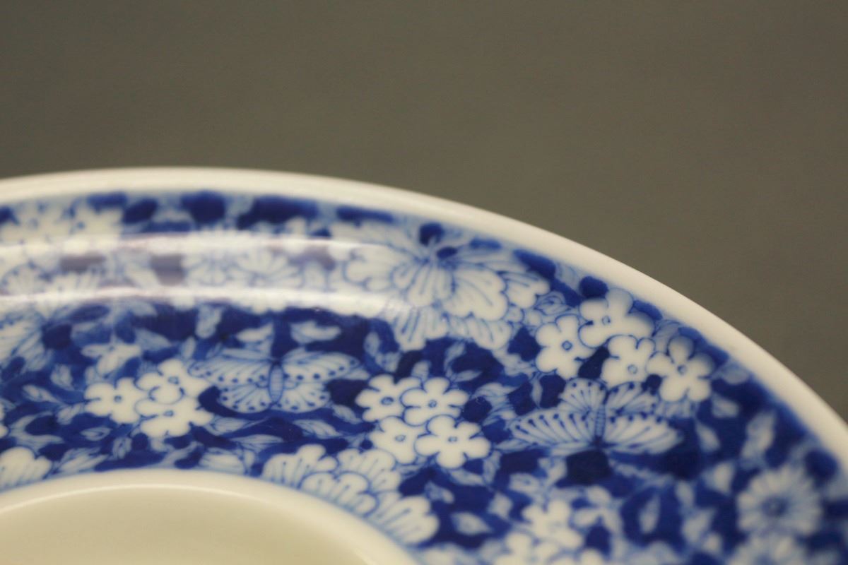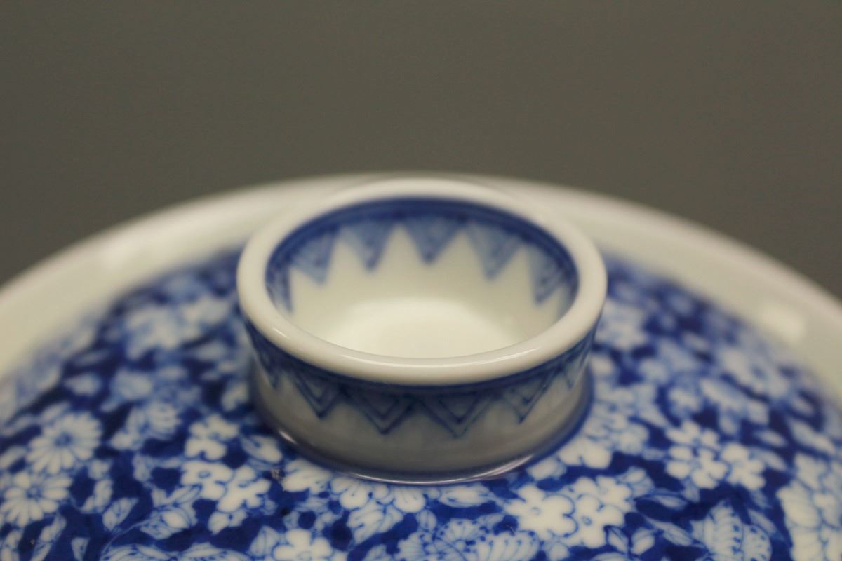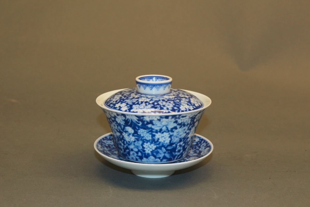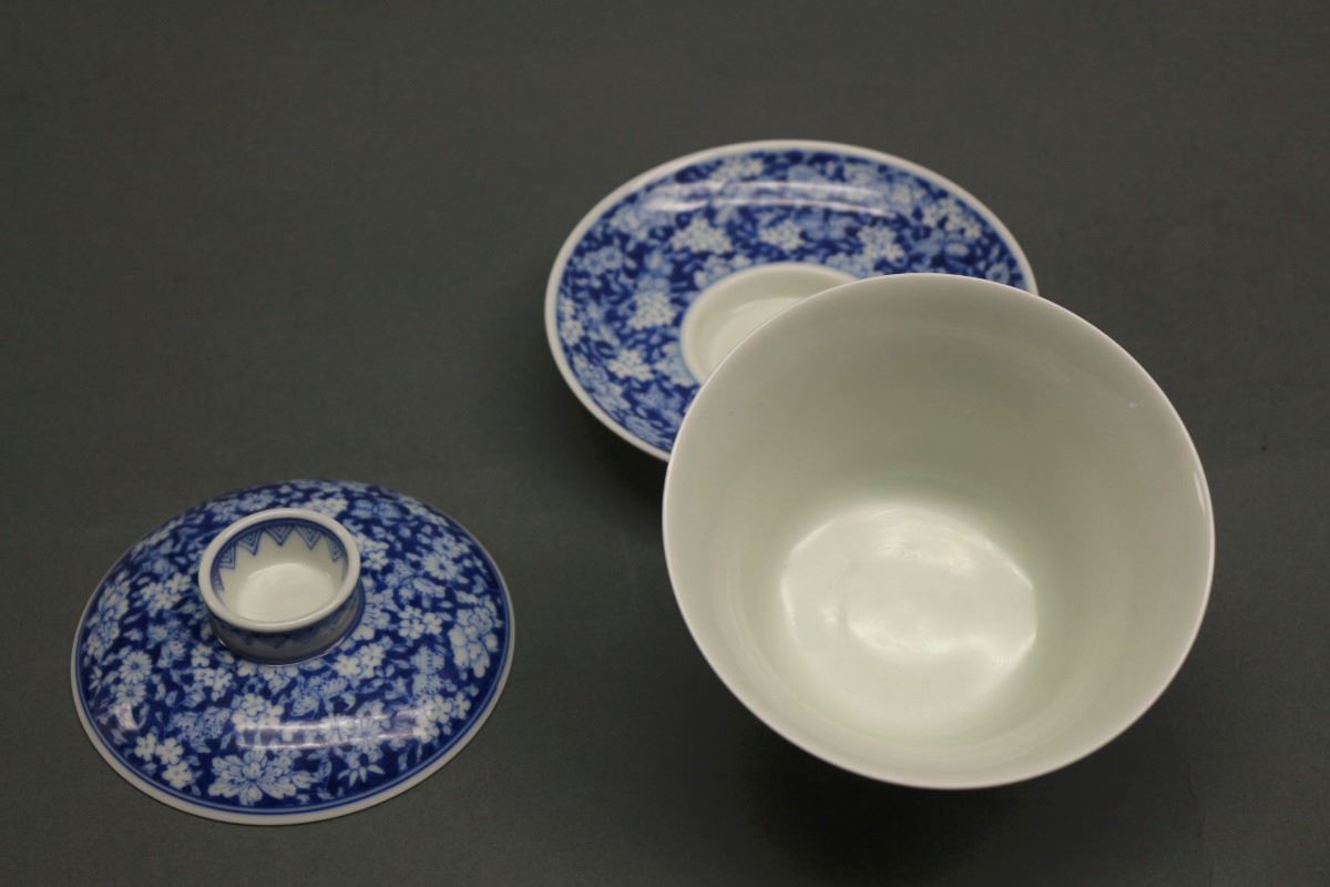 A Chinese blue and white porcelain cup with lid and tray, all featuring peony blossom design on the exterior. Six-character seal on the base. Max Diameter 4.5" Height 3.75"