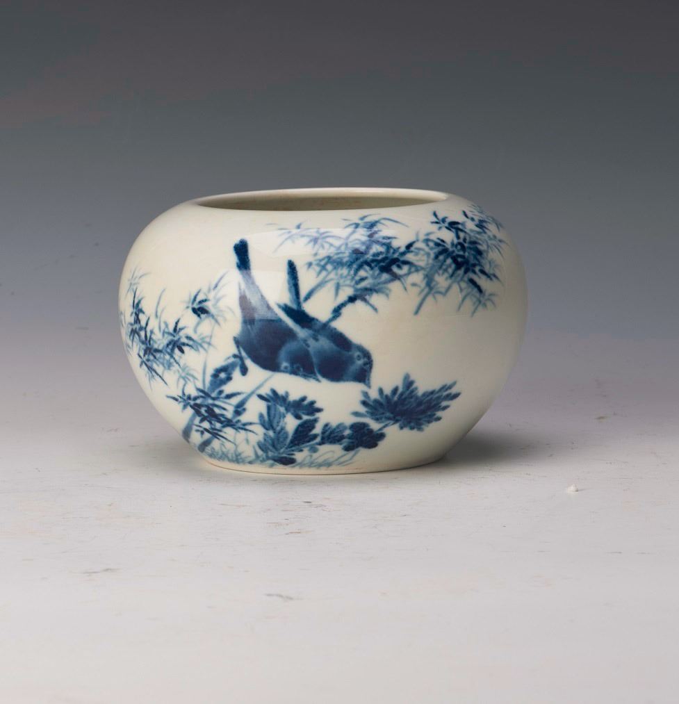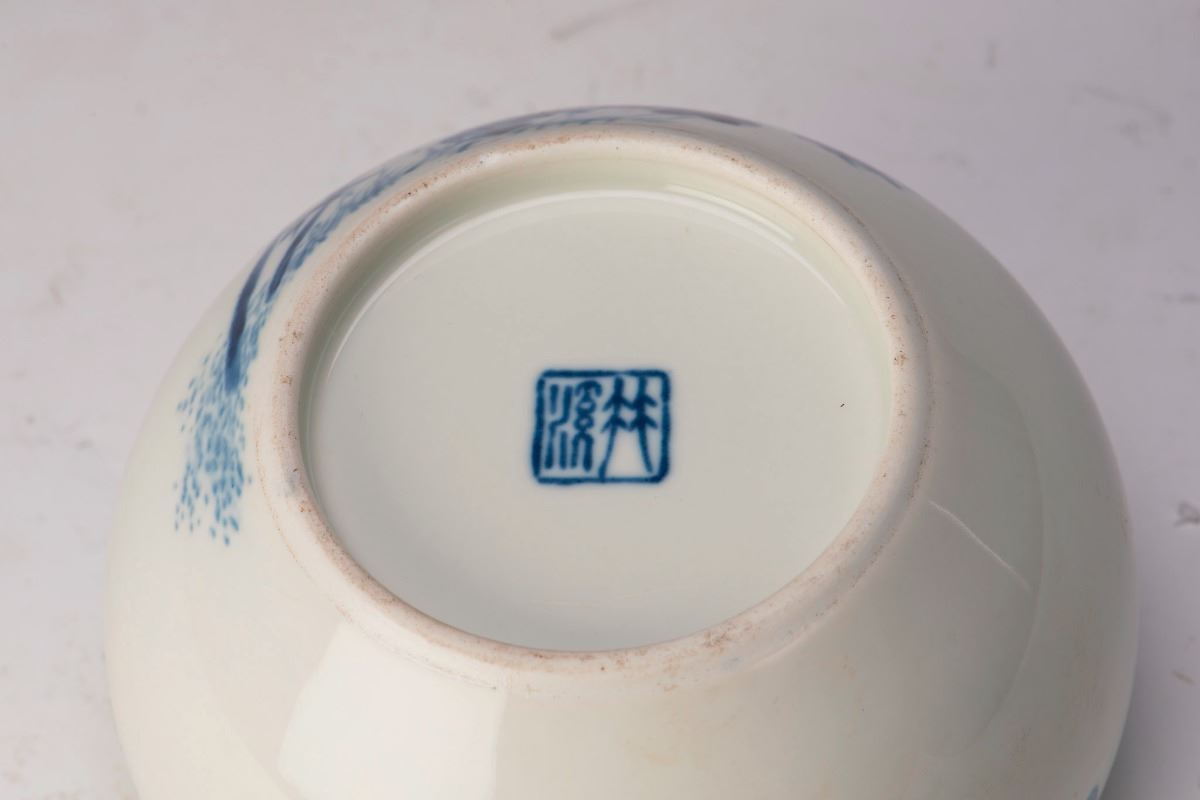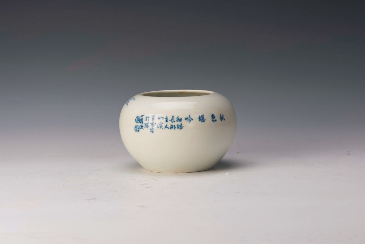 A blue and white porcelain jar with 'Qiu Se Kan Yin' Chinese Painting on the body. Height 6“ Diameter 4”