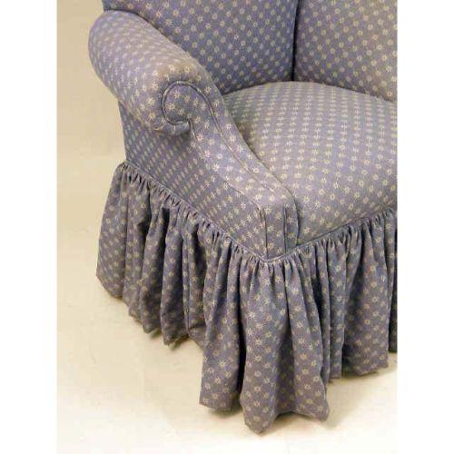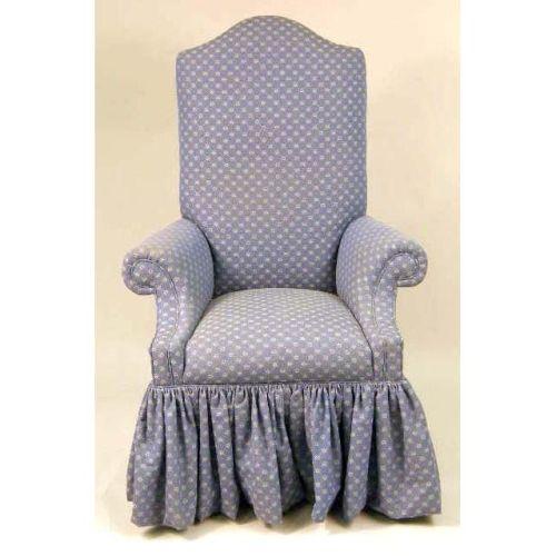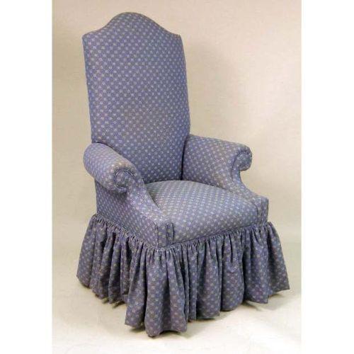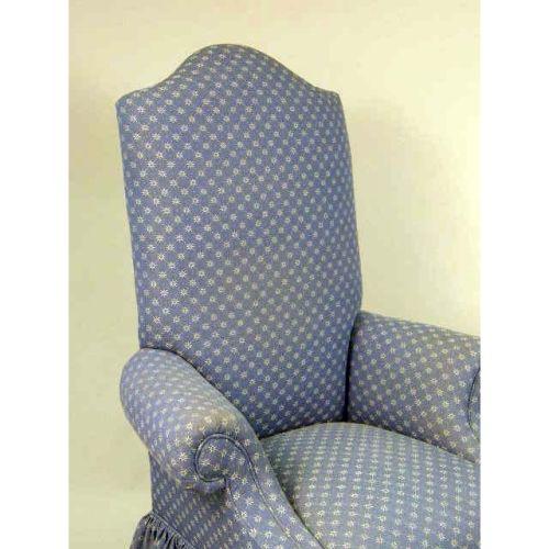 A BLUE COTTON-UPHOLSTERED HIGH-BACK ARMCHAIR<BR><BR>53 1/2" h x 34 1/2" w x 23" d.
