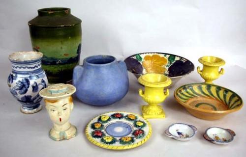 A BLUE DOUBLE HANDLED ART POTTERY VASE; Together with a group of assorted Italian pottery table articles (losses)