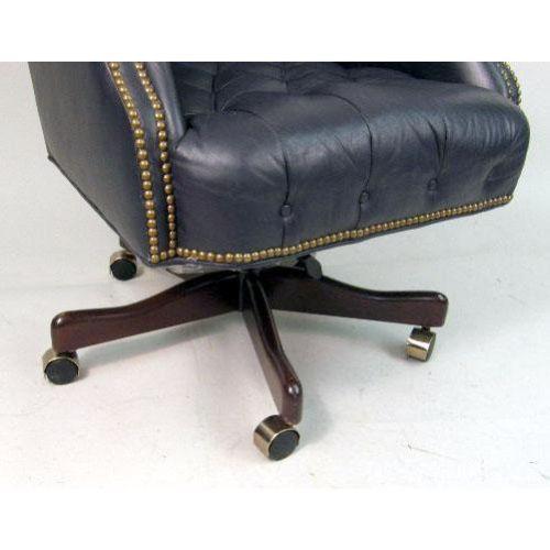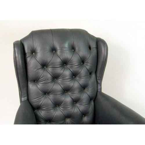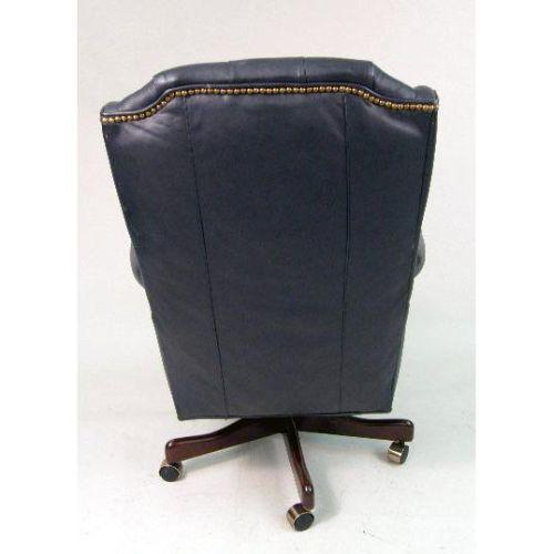 A BLUE LEATHERETTE SWIVELING CLUB CHAIR<BR><BR>44"h