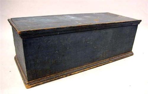 A BLUE-PAINTED POPLAR BLANKET CHEST; Mid-Atlantic States, fitted with a till, losses and repairs