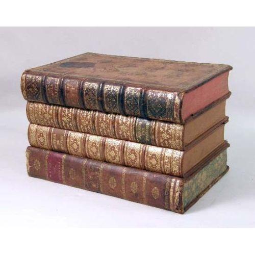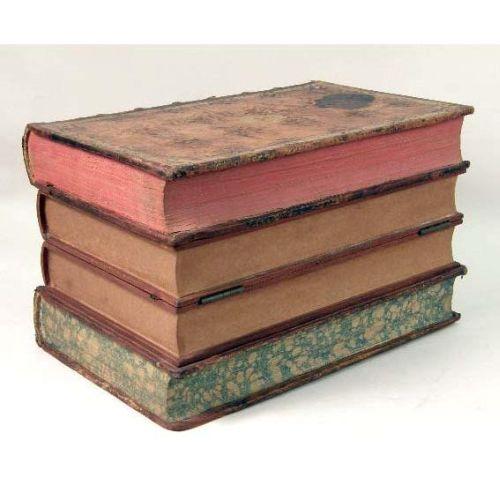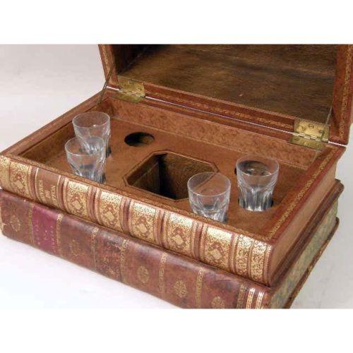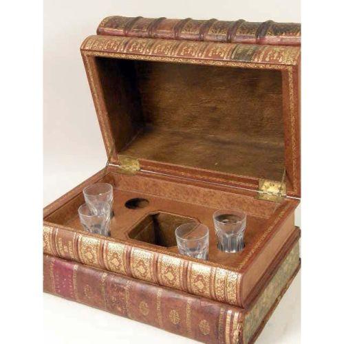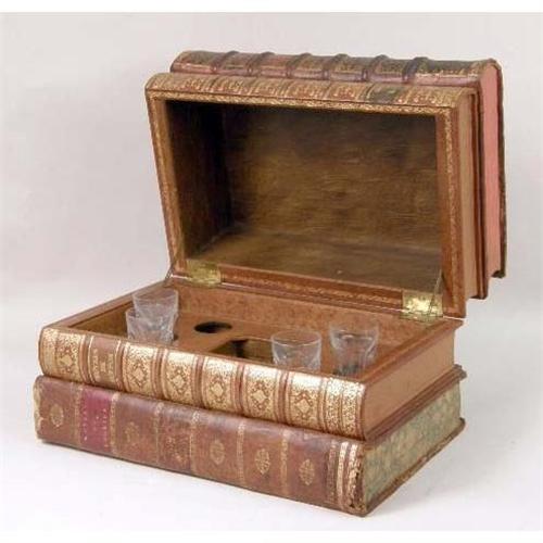 A BOOK-FORM TANTALUS<BR><BR>With four colorless glasses, two with losses, decanter missing, 16-1/2"w