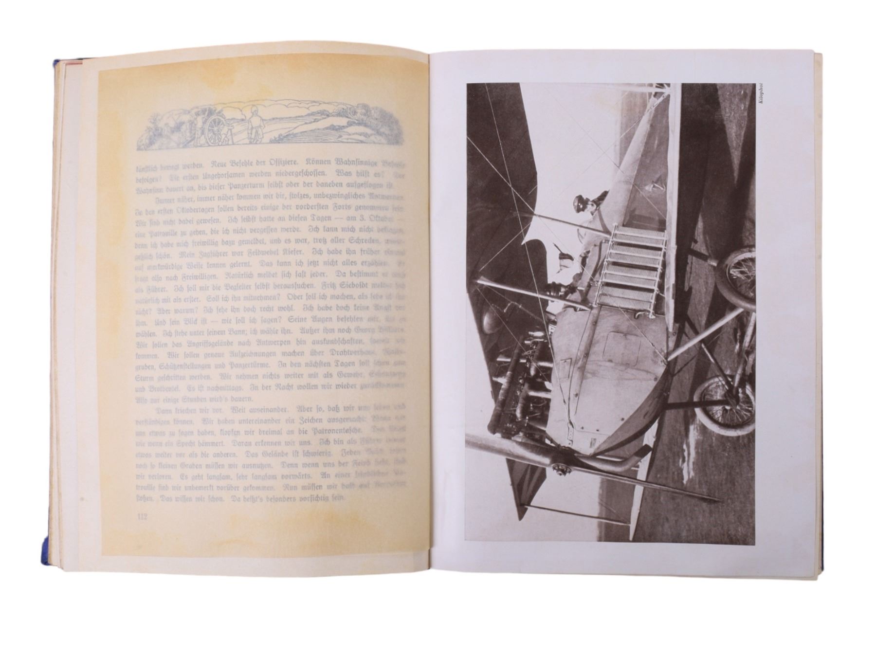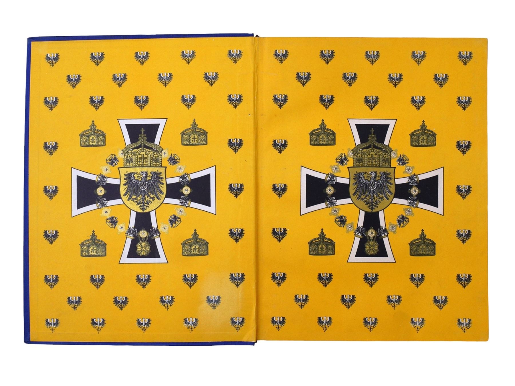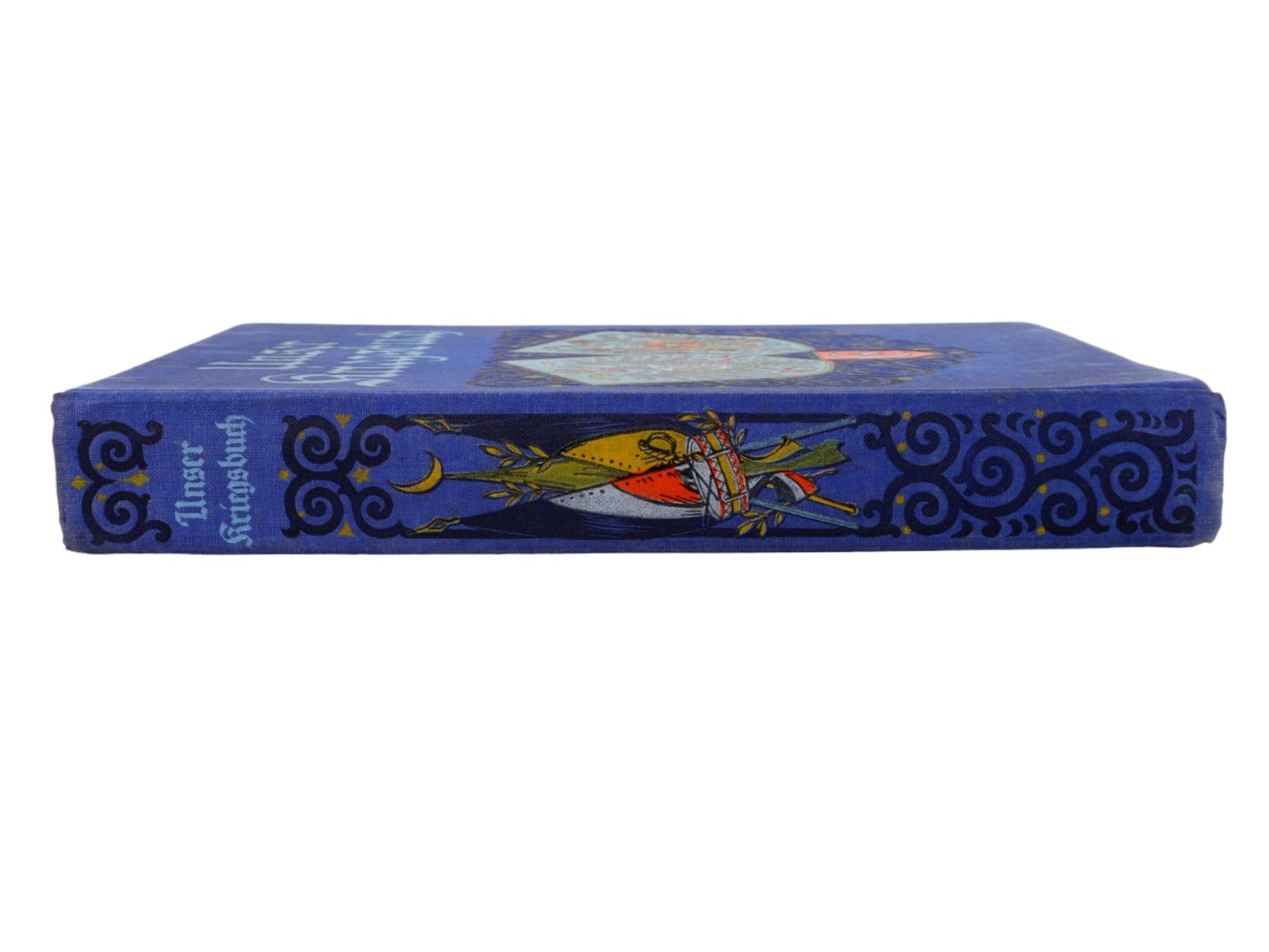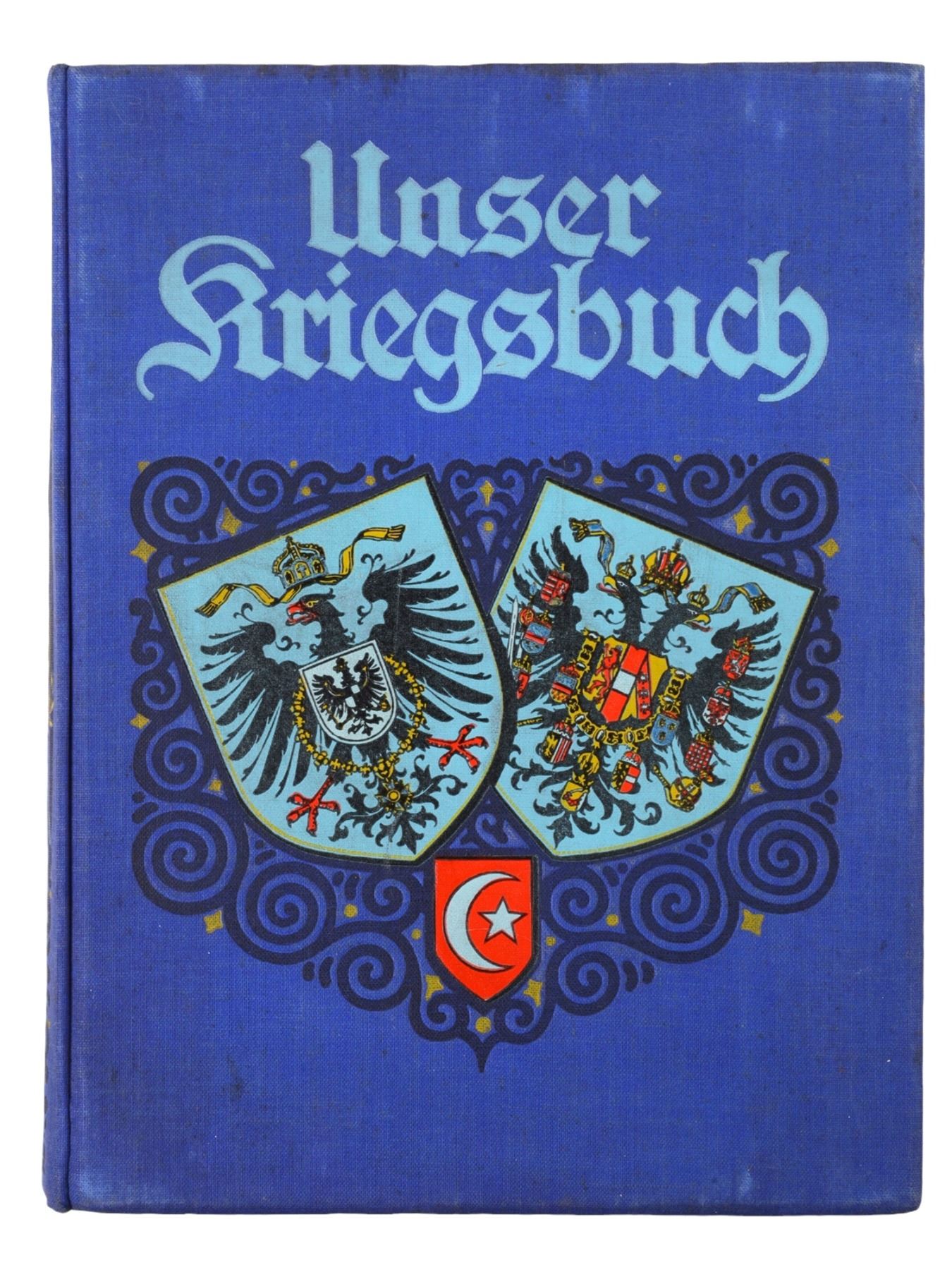 Description: Bearing Adolf Hitler's 'Ex Libris' book plate on the inside of the first page. A 'Jugendbuch' (young person's book) relating to the German and Austrian militaries in WW1. The dark blue cloth cover shows respectively the coat of arms of Imperial Germany and the coat of arms of Imperial Austria, with the Ottoman star and crescent beneath them, set under the stamped title in light blue lettering and set within stamped black swirling design with gilt portions appearing like stars. The spine is of a similar design but with the crossed flags of Germany, Austria, and Turkey, instead of the coats of arms. The inside covers show the German Imperial Arms set on an Iron Cross and surrounded by crowns, all within a yellow field patterned with Eagles. Many photo plates and illustrations within.