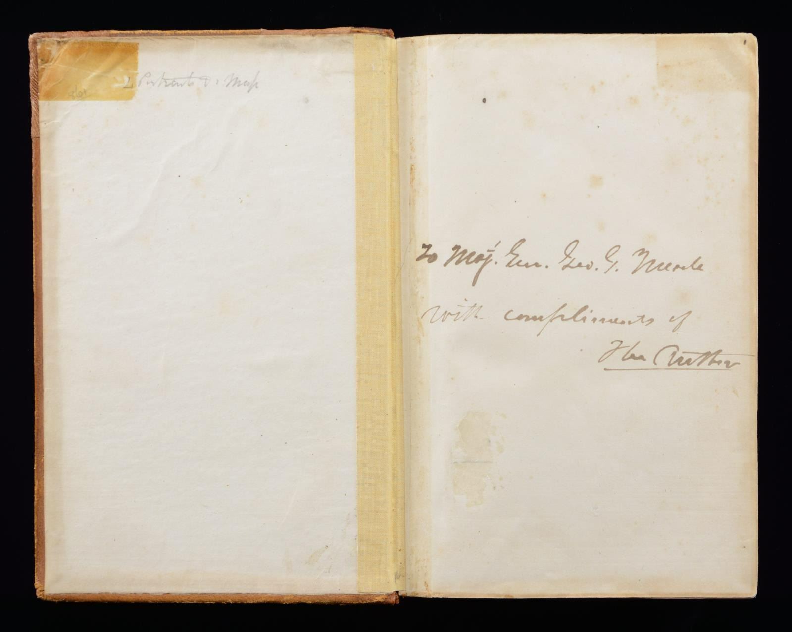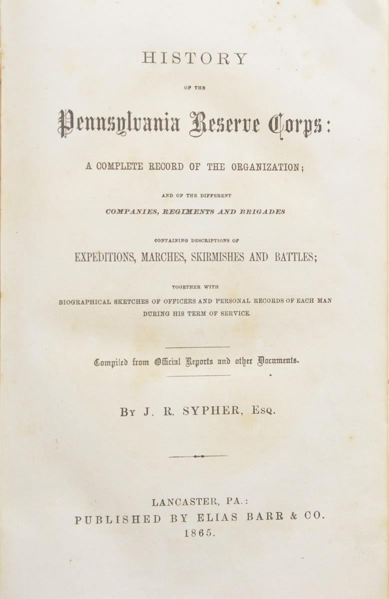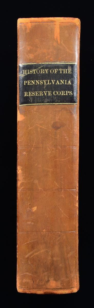 CORPS" PRESENTED TO MAJOR GENERAL GEORGE G. MEADE. This book was written by J.R. Sypher Esquire, Esq. and published by Elias Barr & Co. in 1865 at Lancaster, Pennsylvania. The book has a period inscription on the first page that reads "To Maj. Gen. Geo. G. Meade with compliments of The Author". This book was undoubtedly presented to General Meade in recognition of his role as Division Commander of the Pennsylvania Reserves early in the war. The importance of this volume is enhanced by the handwritten annotations & corrections made by General Meade regarding the Gettysburg Campaign. UNATTACHED ACCESSORIES: an information card relating to the book and its history. CONDITION: the book remains quite solid with some abrasions to the leather binding and slight losses at the corners. The pages have yellowed a bit with age, but the print is easily legible. Engravings are present and quite clear. A fine example of an interesting book belonging to one of the key figures of the American Civil War. (02-19788/BF). $800-1,500.
